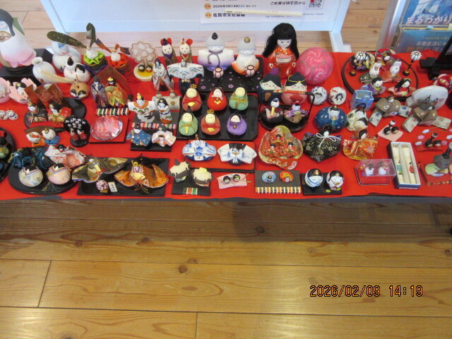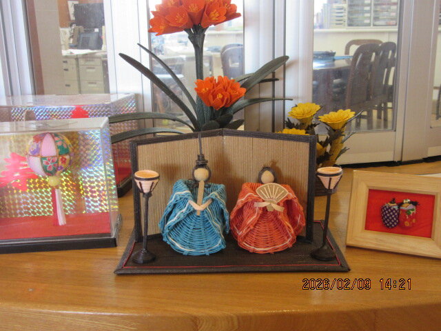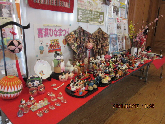 嘉瀬公民館のフリースペースにお雛様を展示しています。