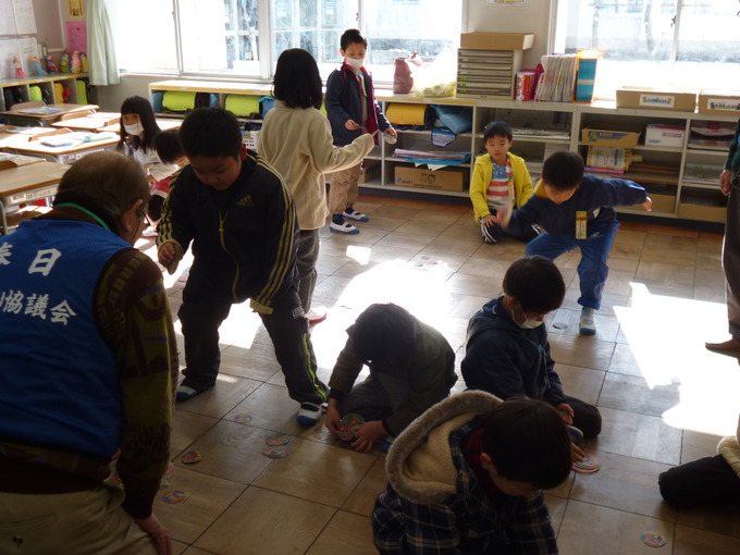 次は、「めんこ」遊びの説明です。初めてする一年生に「めんこ」を渡して「めんこ」をひっくり返させるのは難しいだろうと考え、真ん中を少し曲げて与えました。それでもかなり手こずりました。しかし、「めんこ」が返った時はたいへん喜びました。練習のかいがあってほとんどの子ども手たちが上手になりました。