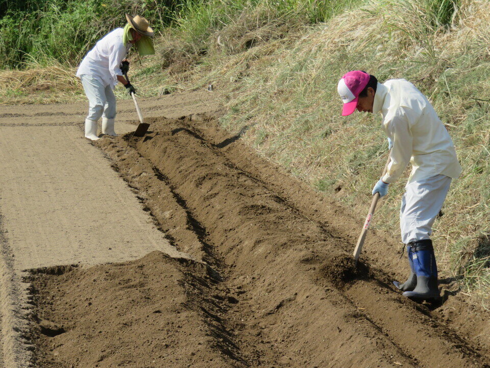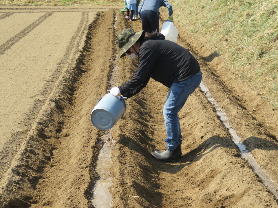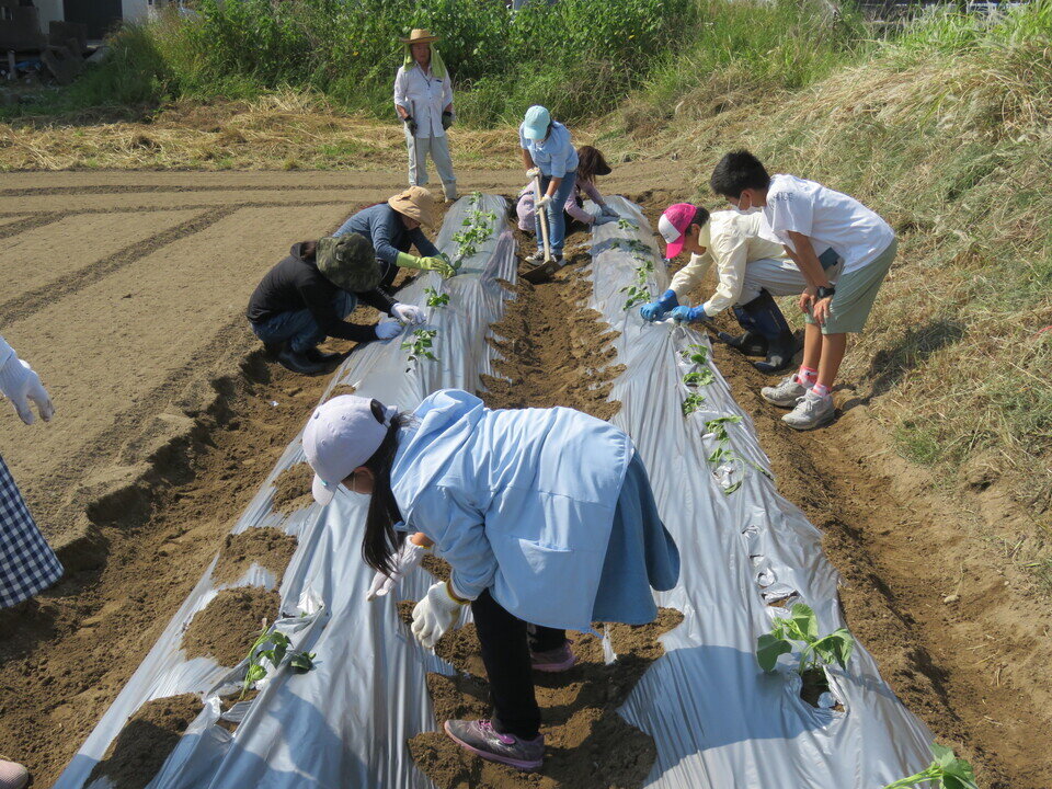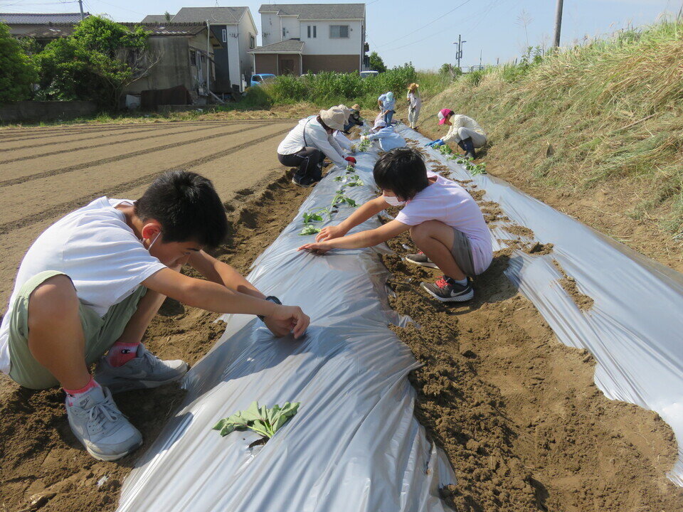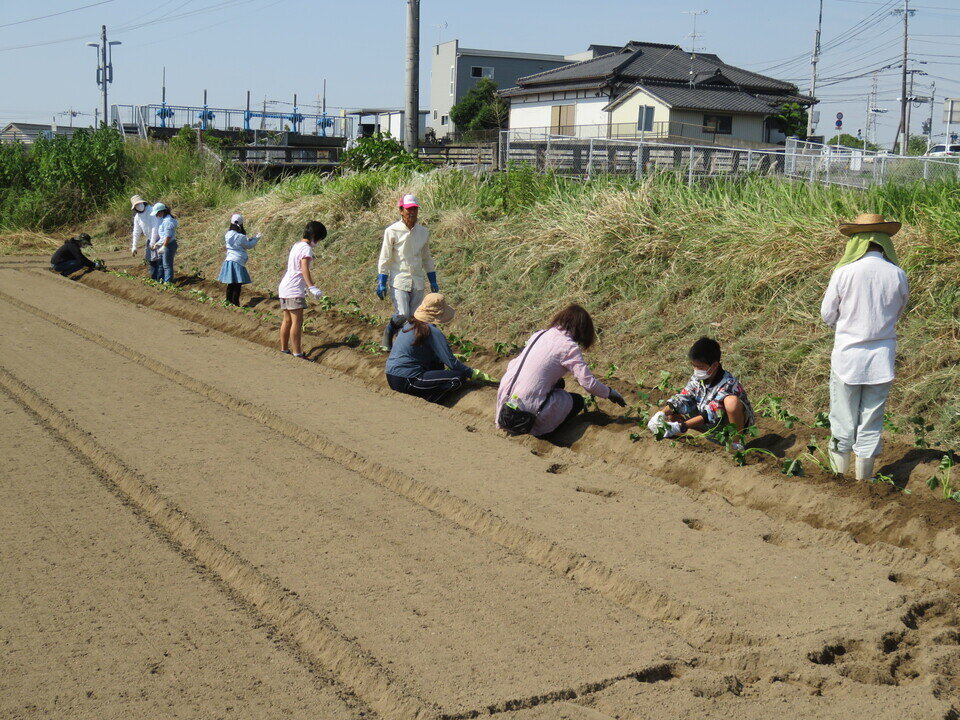 日にち:6月2日(木)苦土石灰及び鶏糞散布 6月3日(金)堤防のり面の除草 6月4日(土)畝づくり、畝に水を撒く、芋苗植え、マルチ張り、芋苗を表に出す作業公民館南の畑を借り受け、2年ぶりに野菜づくり教室を行いました。地域の子どもと共にサツマイモづくりに挑戦し、秋のイルミネーション時に焼き芋として参加者に振る舞う予定です。