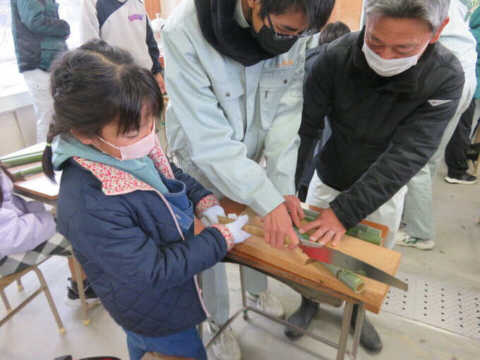 雪が降りましたが、楽しみにしていた「ミニ門松つくり」が無事に開催。高志館高校の生徒の送り迎えからスタートし、公民館から高校への移動中もさっそく雪合戦しながら仲良しに。17名の環境緑地科の生徒さんが先生となり、ほぼマンツーマンでの手とり足取りの作業です。まずは青竹3本を切る作業から。節の部分を斜めに切ると、笑った口のようになるからと。"笑う門には福来る"のことわざ通り。「のこぎりは引く時に切れるからね」と優しい声掛けがあちらこちらで。時々先生たちも縄の結び方が難しく手こずる場面もありましたが、協力しあって1時間半で、真新しい青竹の香りと新年の飾りが華やかで立派なミニ門松の完成です。
