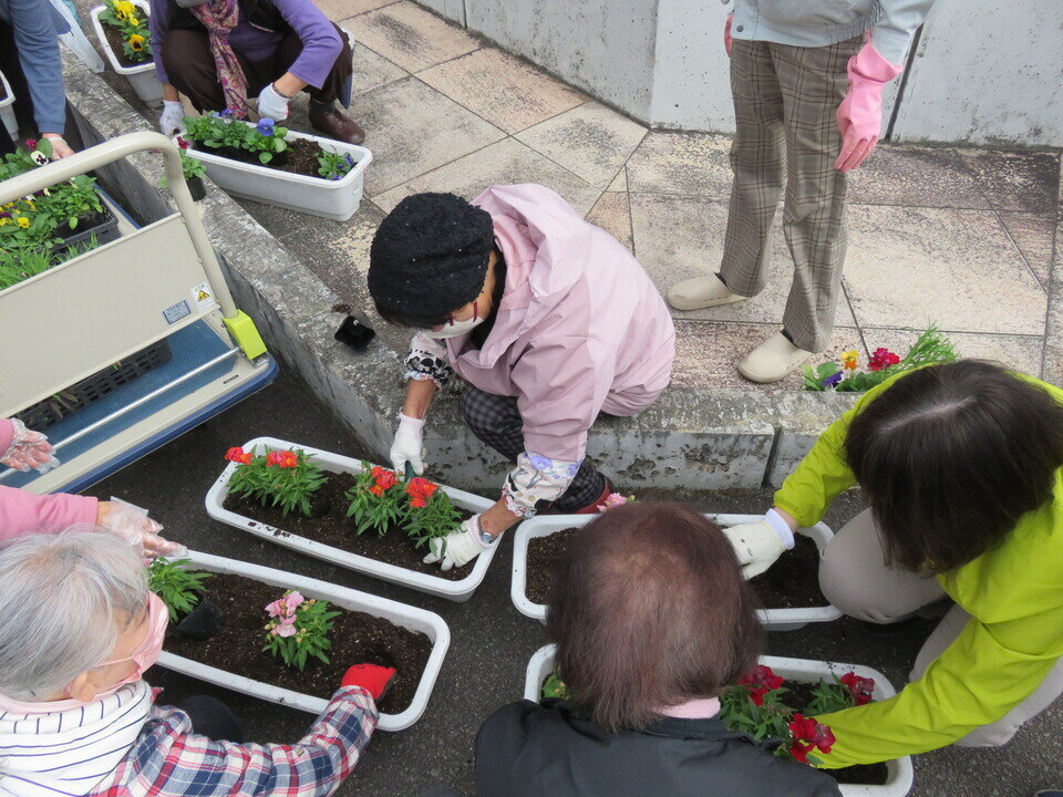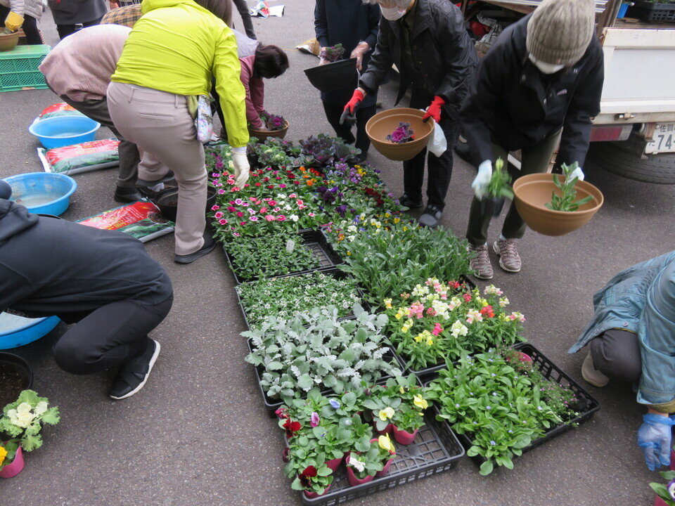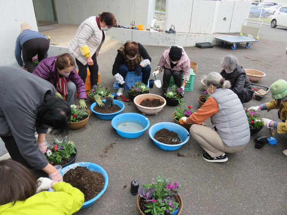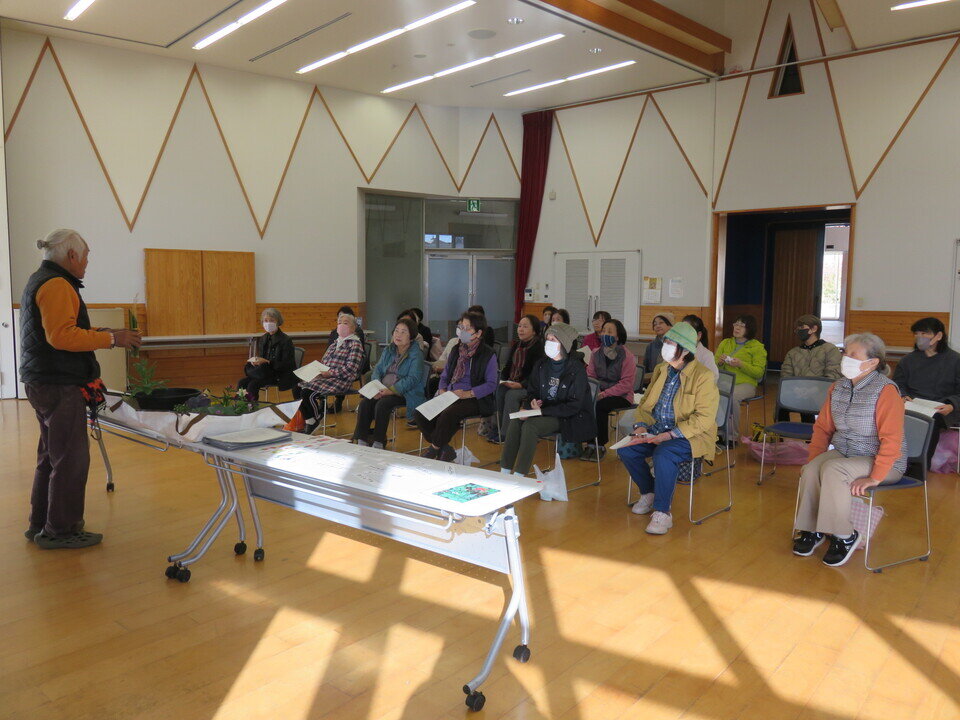 日にち:12月4日(木)講 師:中川 達也さん(緑のカウンセラー)内 容:お正月の寄植え 春日リフレッシュ大学第7回・花とみどりの教室第5回 合同で「お正月の寄植え」を開催しました。 園芸の講習をした後、公民館プランターに分担して花植え作業をしてもらいました。 その後、各自お正月用の竹やお花を選んで寄植えをしました。寒い中でしたが、花の種類や色の配置を考え、中川さんにアドバイスをもらいながら楽しく作業されていました。
