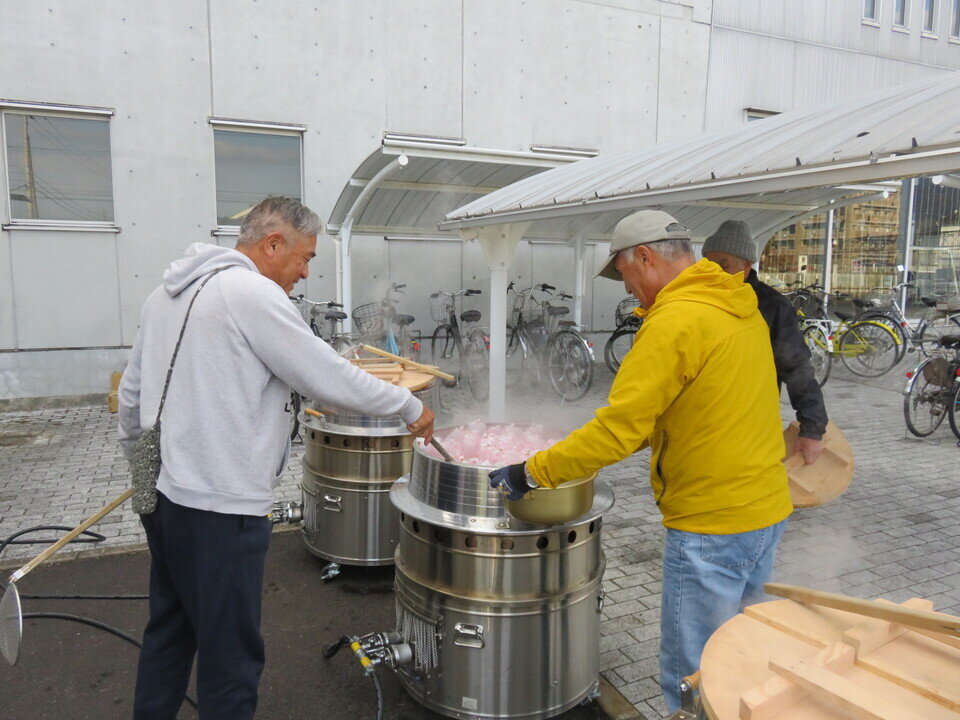 毎年、イルミんーション点灯式に合わせて、炊き出し訓練を兼ねた災害時用の大釜で炊いた「防災食ハイジェックス」のご飯を使ったカレーや焼き芋、子ども達を対象としたお菓子の抽選会、コーヒー、お茶の振る舞いがありました。カレーの振る舞いは、北玄関から大会議室まで列が続くほど大盛況でした。