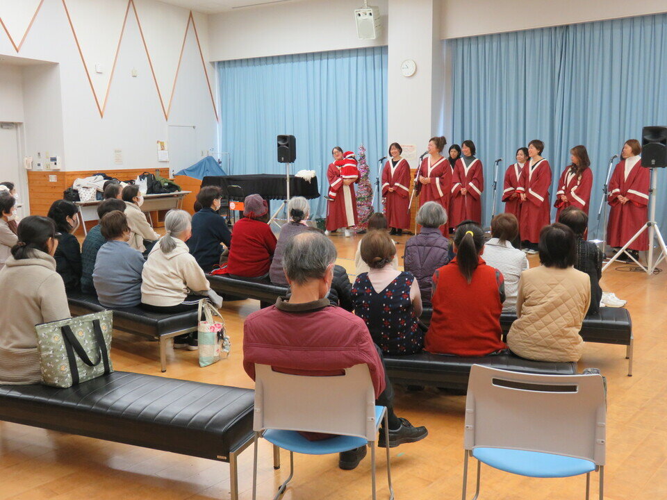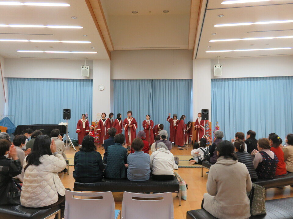春日リフレッシュ、花とみどりの教室の講座と地域の方々と一緒に楽しむゴスペルコンサートを開催しました。赤ちゃんから大人までが、迫力ある歌声に魅了され、心温まるクリスマスイベントになりました。途中でサンタさんも登場!子ども達に、ささやかなプレゼントを持ってきてくれました。