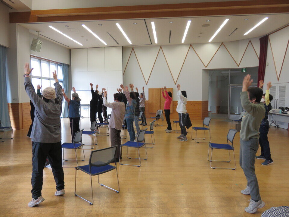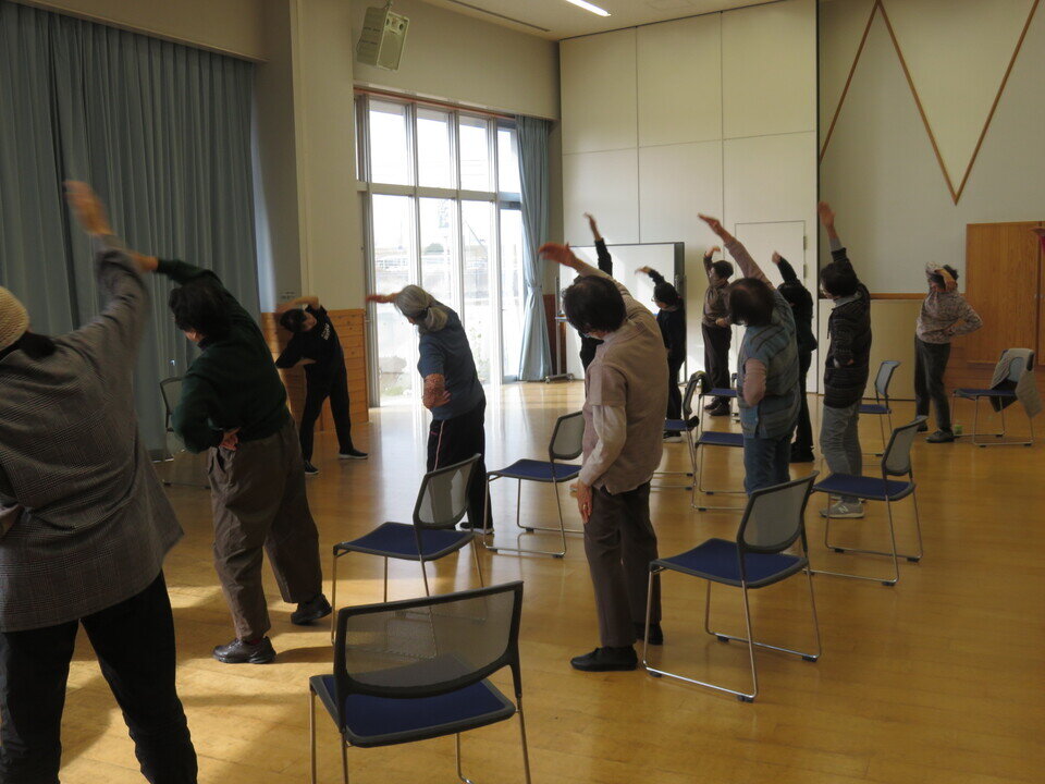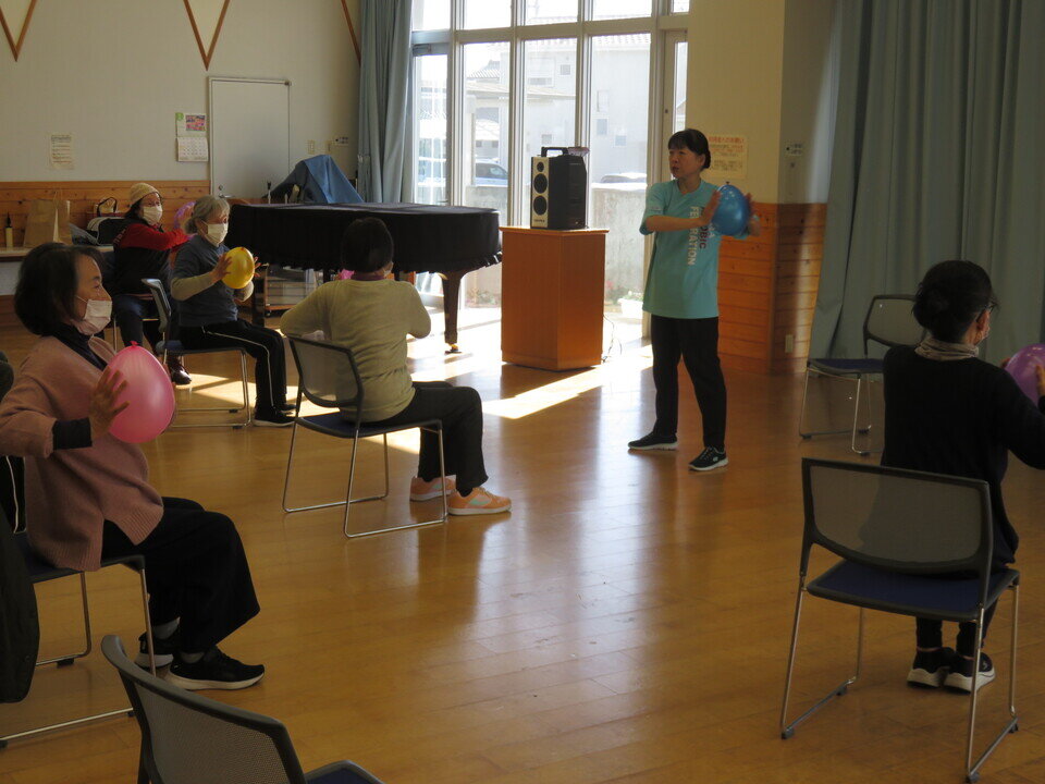 それぞれ、「ボクササイズ」「昔あそび」をテーマに、椅子に座って体を軽くほぐす体操から始まり、右手と左手を逆に動かす運動では、頭の体操といった感じでとても楽しく、笑い声が飛び交っていました。気温の低い日でしたが、風船を使った体操や立ち上がって曲に合わせて体を動かすなど、体を温めることができました。