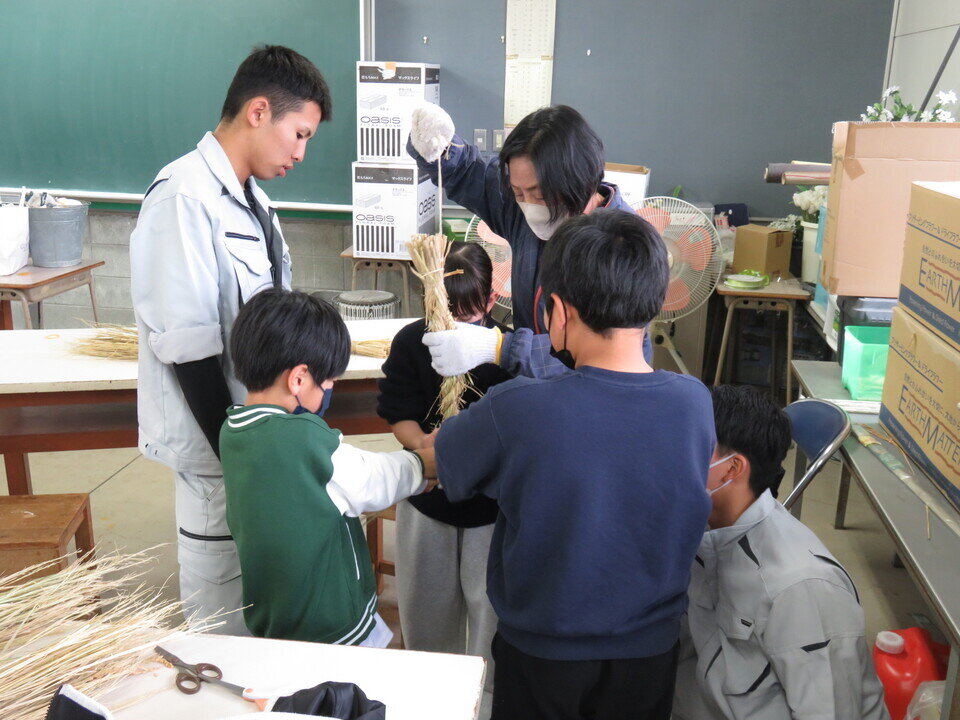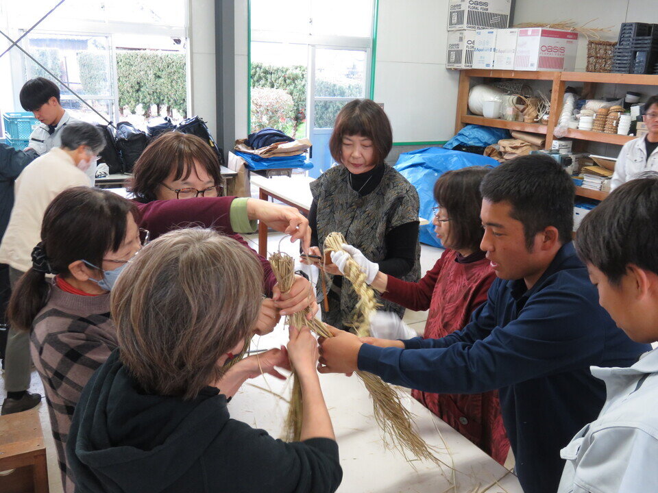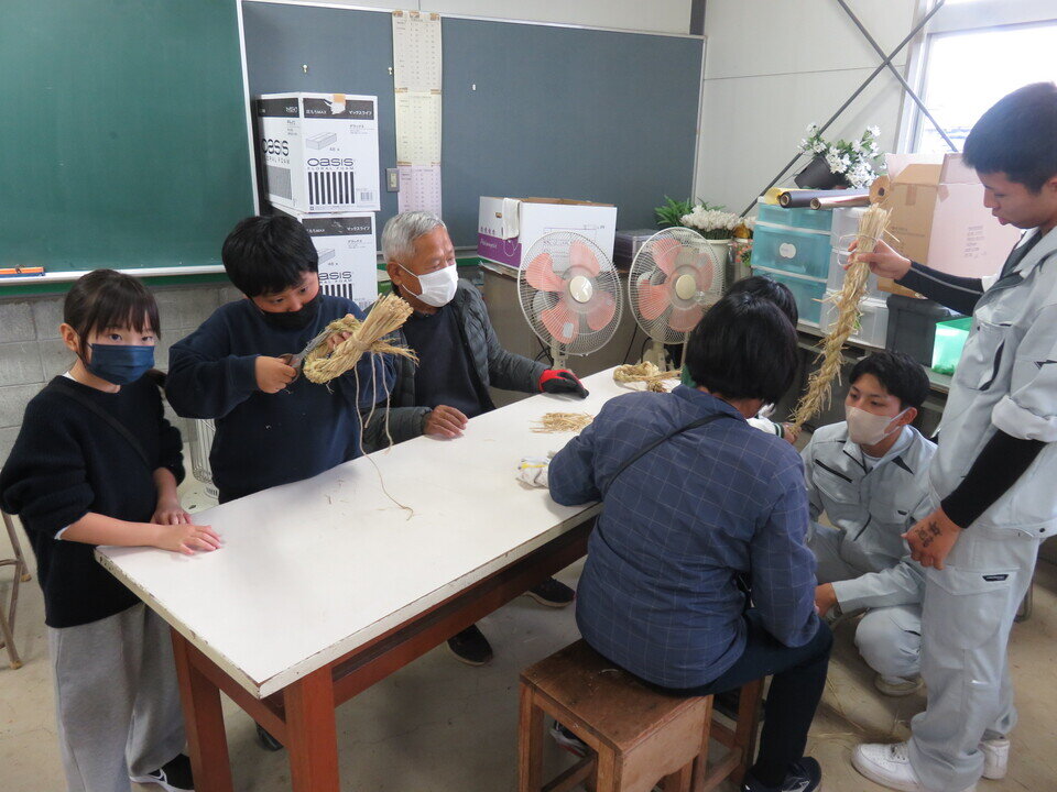 4人1組で束ねたワラの上部を1人が持ち、その下部分を3つに分けて3人がねじりながら上部を回すことでしめ縄を作りました。難しい作業でしたが、高校生の指導や地元の有志の方の指導もあり、きれいなしめ縄が出来上がっていました。