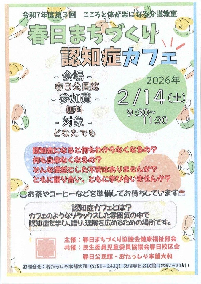 主催:春日まちづくり協議会 健康福祉部会共催:民生委員児童委員協議会春日校区、春日公民館、おたっしゃ本舗大和