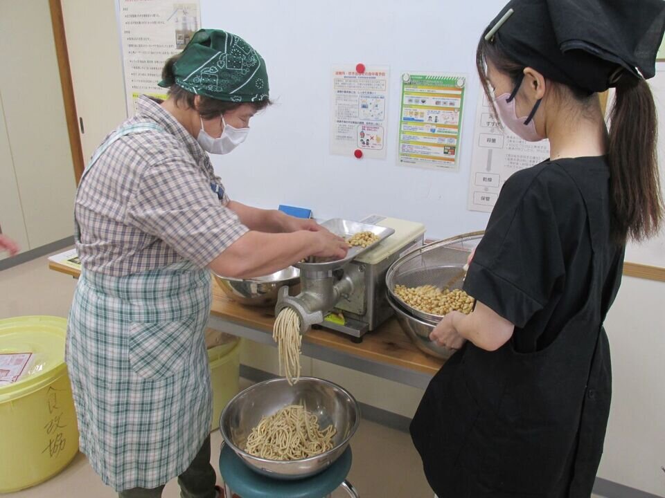 大豆を洗い、一晩水に浸けて柔らかくしておきます。講座がスタートする前に、大豆を圧力釜で柔らかく茹でるところまで、講師に準備しいただきました。