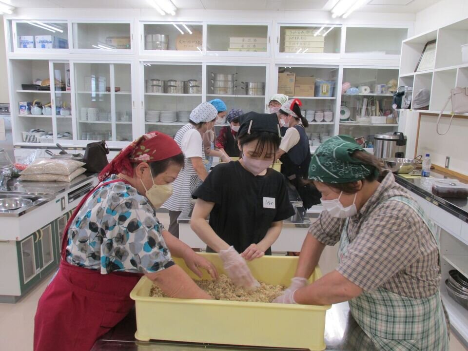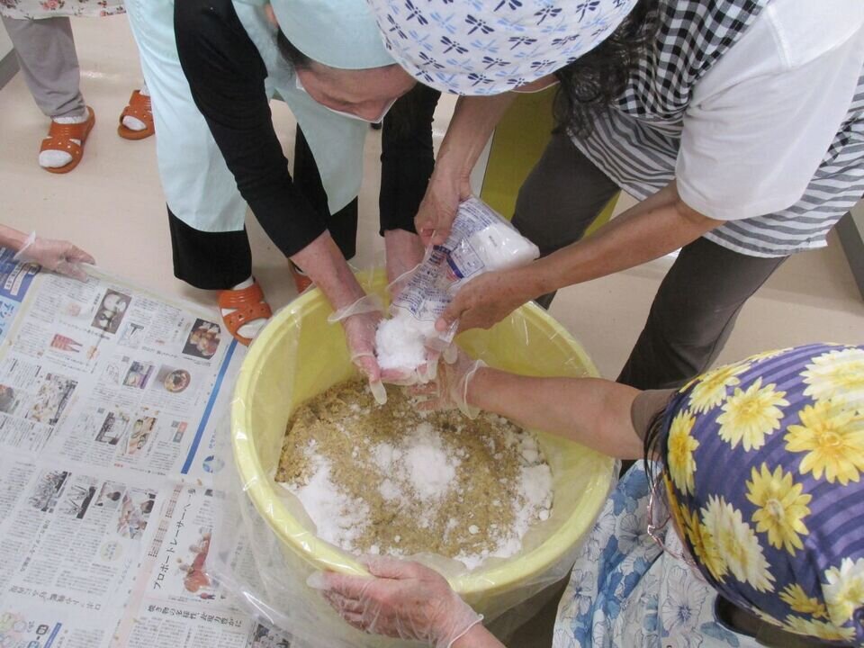 準備ができたら、米、麦に麹をまぶしてある塩きり麹としっかり混ぜ合わせます。