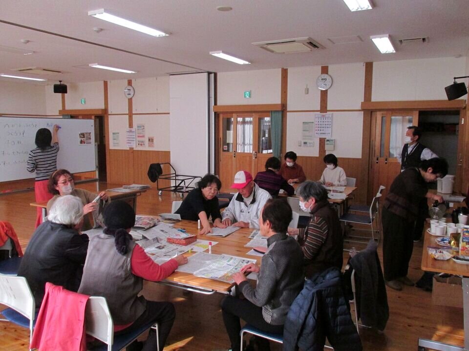 12月17日(水)は、来週にせまった水曜午後のティータイム クリスマス会に向けた盛り上げタイムでした。10人ほど集まっていただきました。プレゼント交換用の袋、グループ分けできるようにクリスマスのキャラクターの首掛け名前札、飾り用の折り紙の鎖などを作りました。