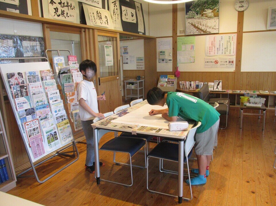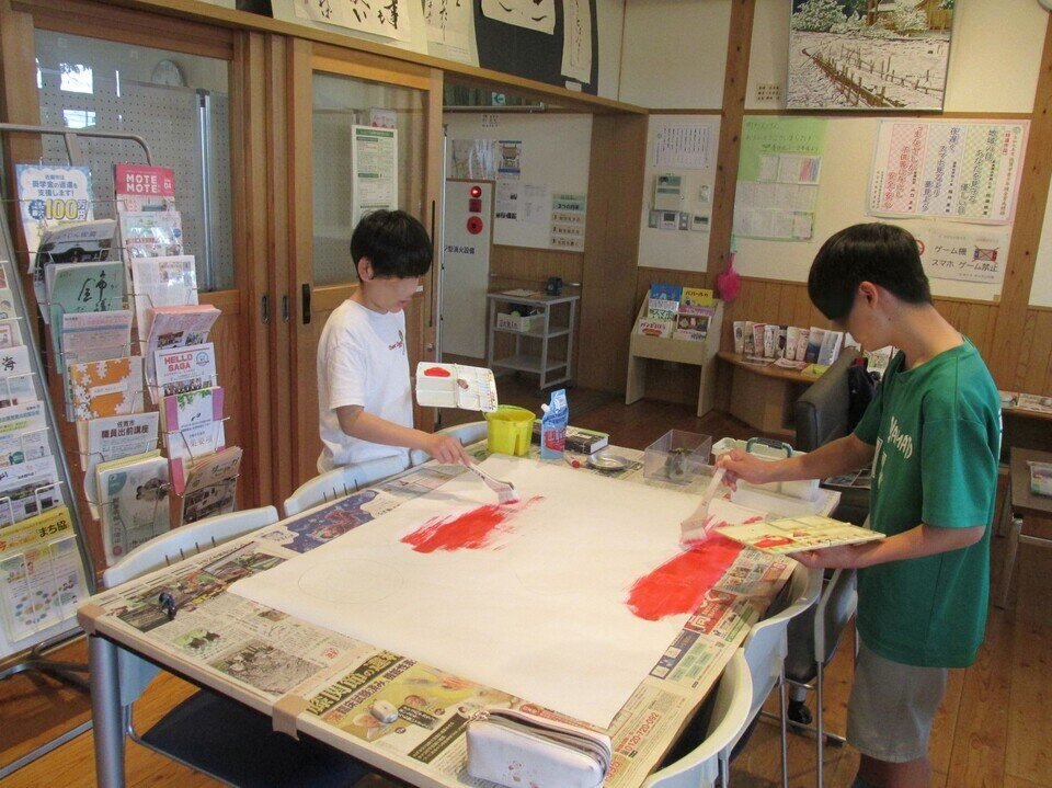 さあ、4月13日(水)用紙、絵の具セット、新聞紙など、準備は整いました。フリースペースで宿題をしている男子中学生(1年生)2人に声をかけると「やってみようか?」と引き受けてくれました(※顔はわからないように加工しています)。
