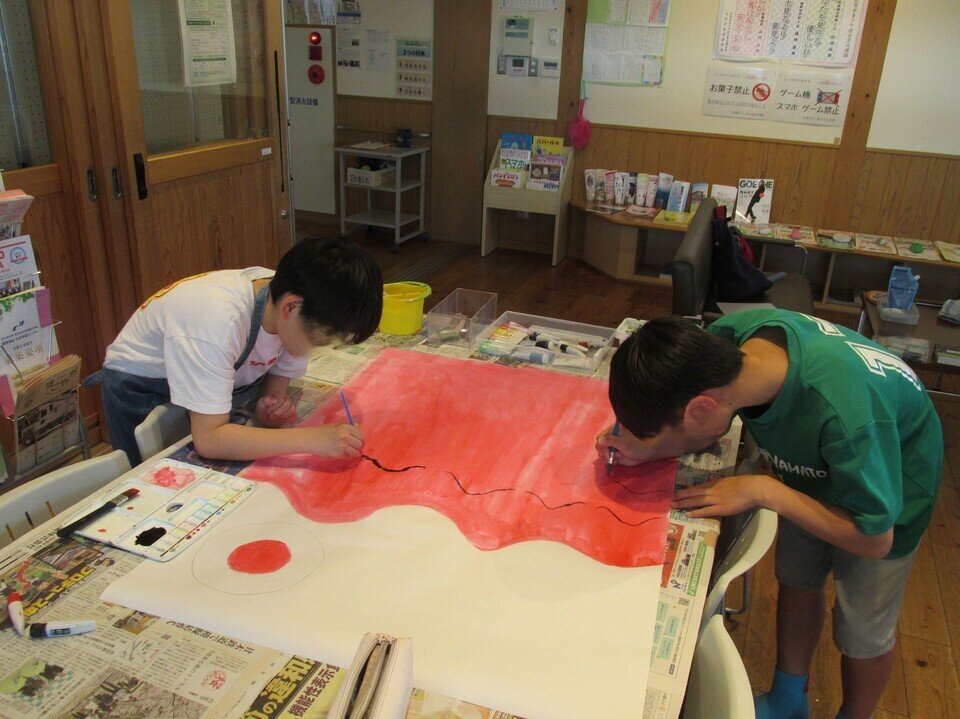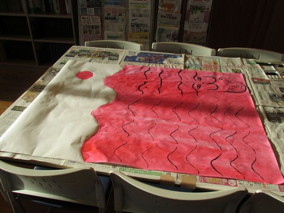 なにしろ2人なので、色塗りも時間がかかりましたが、遊び心も芽生えて楽しんでくれて、味のある仕上がりになりました。北斎?いや、広重?なんてジョークも出ていました。