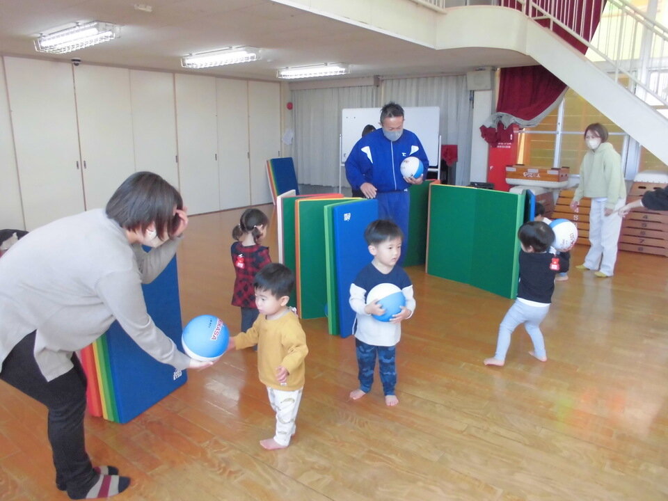 親子体操では、ボールを使った遊びでお母さんと一緒にたくさん身体を動かしました(^▽^)