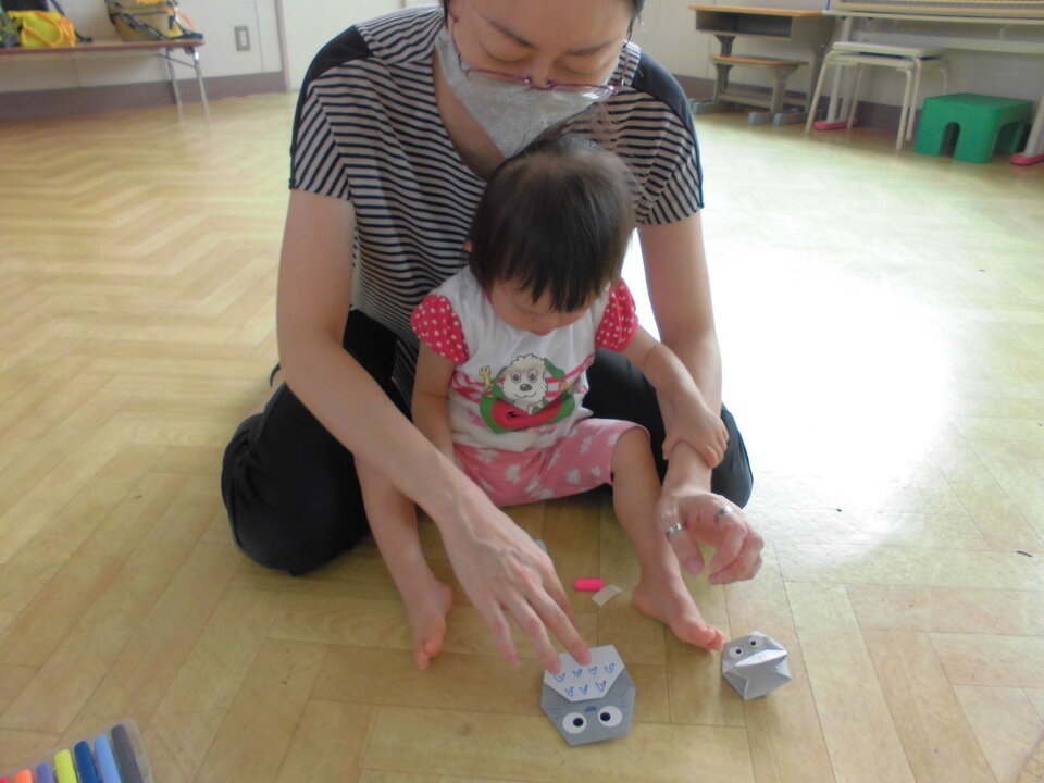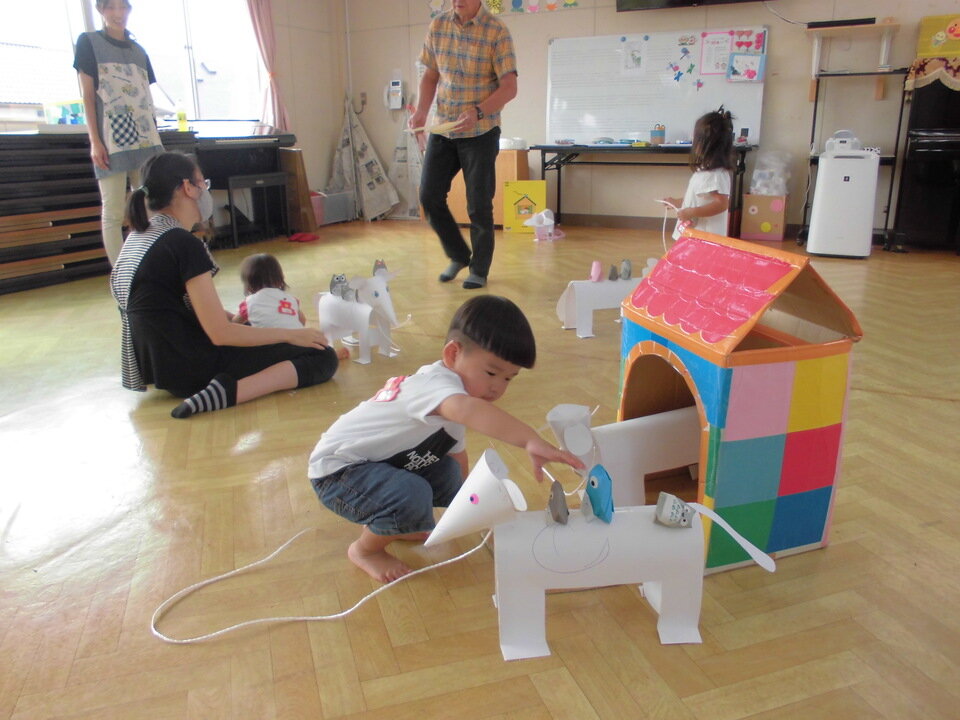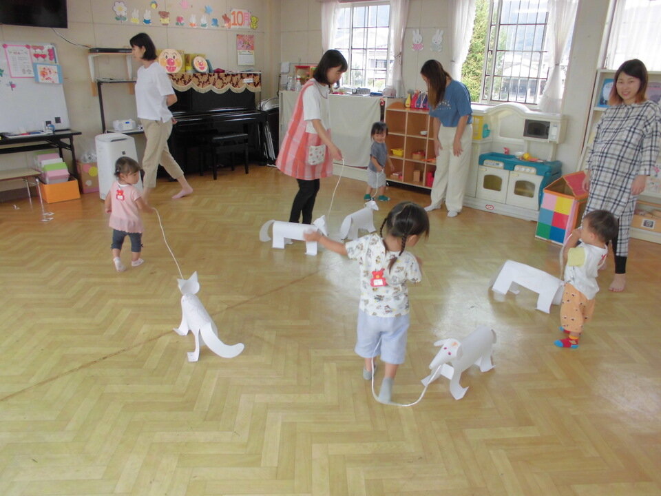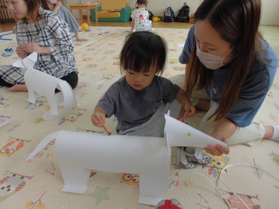 一週目のくまちゃんランドは、講師の牟田先生と「お散歩わんちゃん」を作って遊びました♪ 画用紙を立体に組み立てて、目を貼ったり色を塗ったりしてリードを付けると、わんちゃんの完成♡