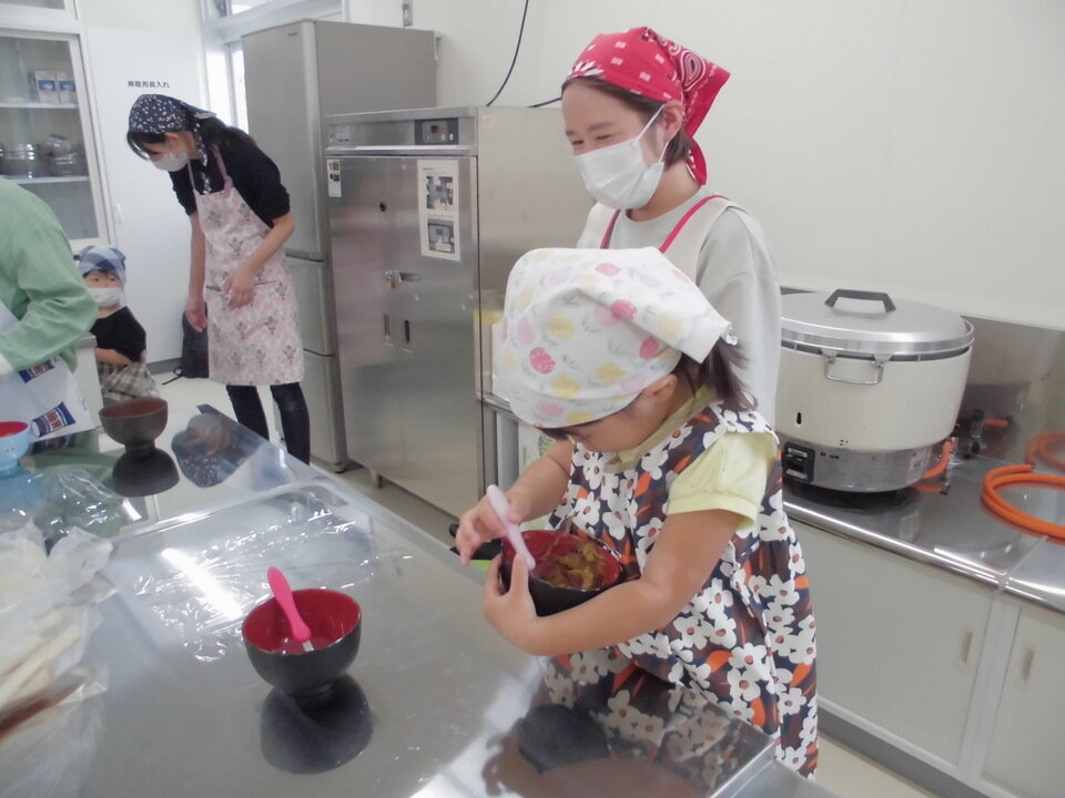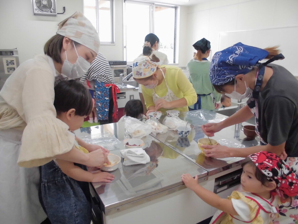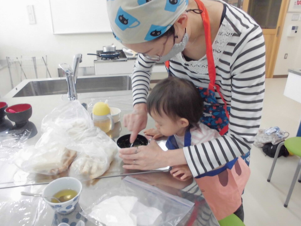 二週目は親子クッキングで、講師に土田和美さんをお迎えして、お芋のロールと簡単に作れるラスクを教えていただきました。 調理室での初めてのクッキングに、緊張した面持ちのお友だちもいましたが、お芋の甘い香りと楽しい調理に、たくさん笑顔が見られて微笑ましかったです。