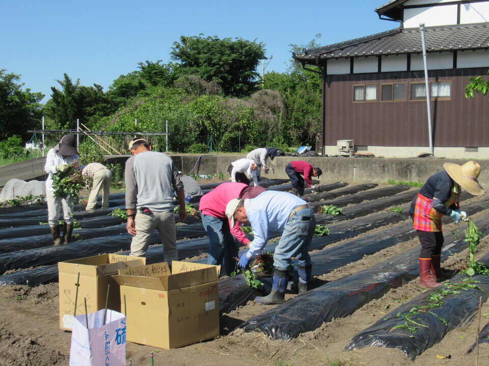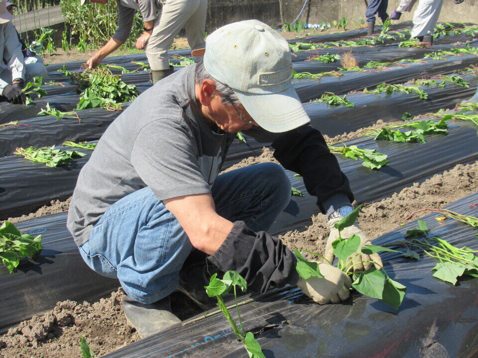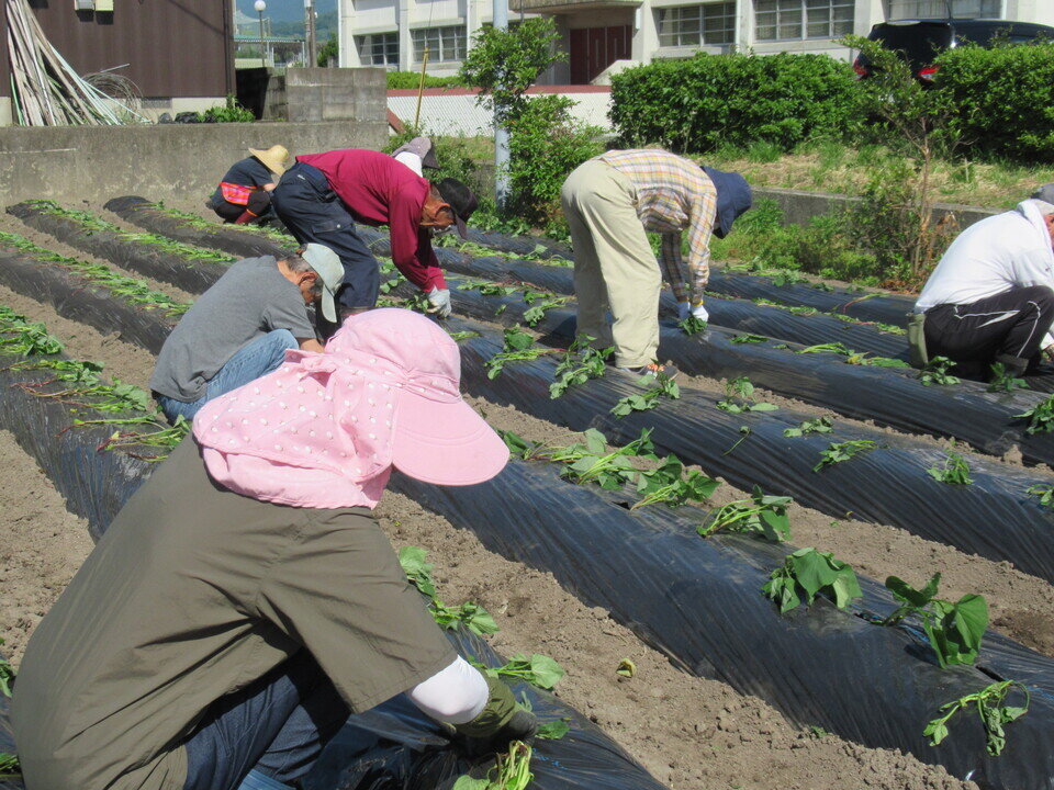 5月19日(日)校区内の一人世帯の高齢者へのプレゼント用及びフードバンクさがに提供するためのさつま芋の苗500本の植え付けを行いました。この取り組みは、まちづくり協議会(農業の良さを活かしたまちおこし部会、住み良い長寿社会づくり部会)、民生委員児童委員協議会の皆さんが協働で行っている事業です。また、この日は、家庭菜園教室の野菜の支柱立て込みの講習会と併せて行われました。【参加者:17名 まち協・民生委員協働事業】