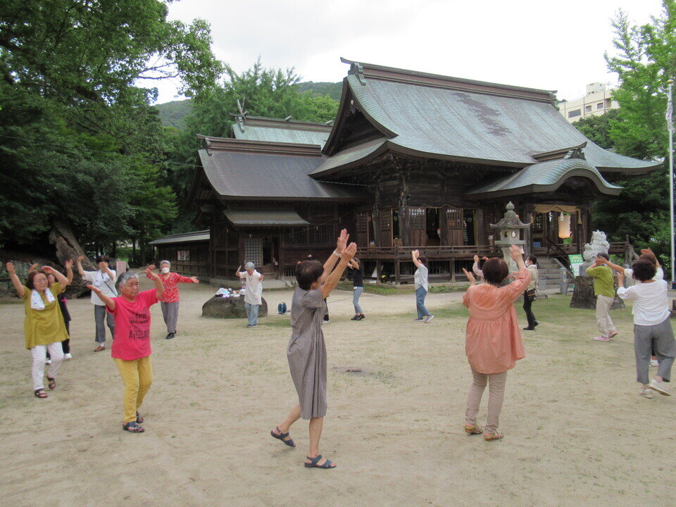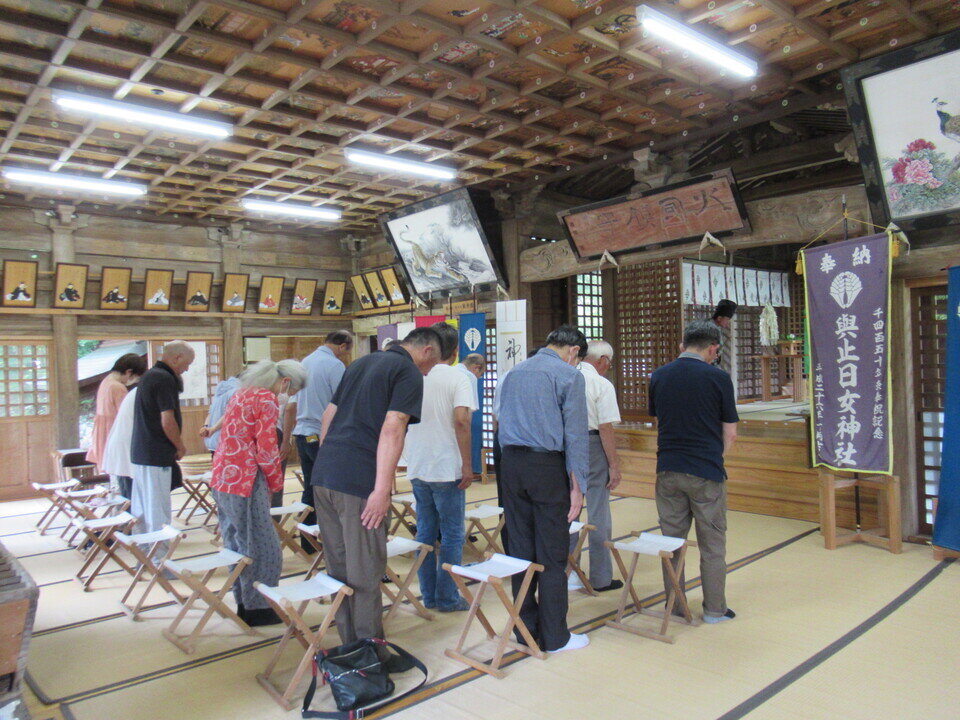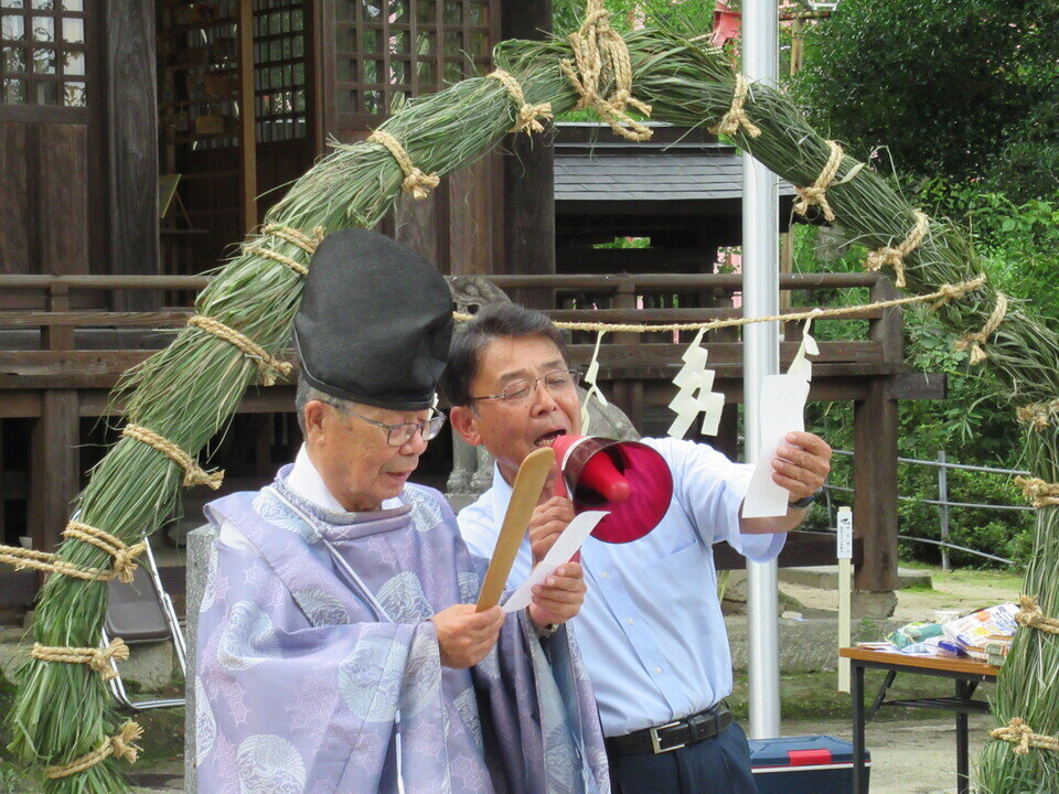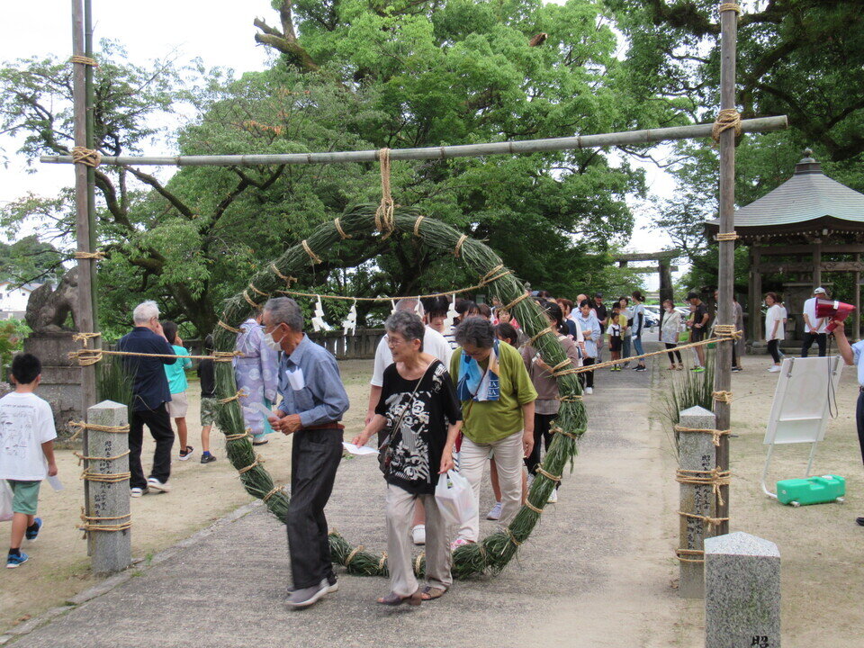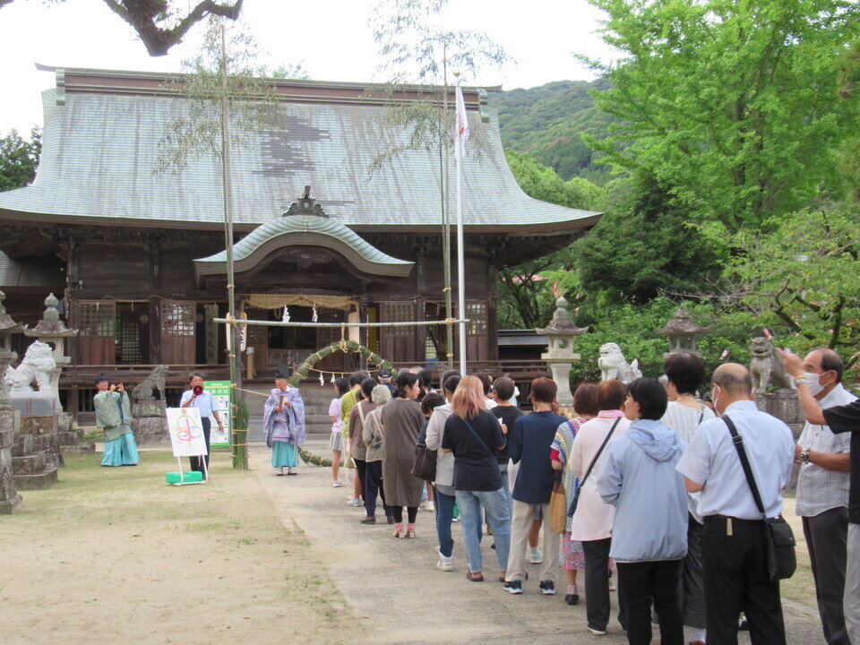 7月18日(木)、新盆に合わせ、與止日女神社で夏越祭が行われました。川上では大正から昭和にかけて養蚕が盛んだったことから新盆でお盆を迎えていたそうです。18時から本殿で神事が行われ、続いて無病息災を願う「茅の輪(ちのわ)くぐり」へと続きます。茅の輪とは茅(かや)を束ねて作った直径2メートルほどの輪で、今年も前日の17日に地元のみなさんが集まって製作し本殿の正面に設置しました。茅の輪くぐりには毎年地元を中心に多くの人が参加していて、作法にのっとり、決められた祝詞を唱えてから左回り、右回り、左回りの順にくぐり本殿に拝礼しました。最後は輪になって盆踊りを踊ってお開きとなりました。