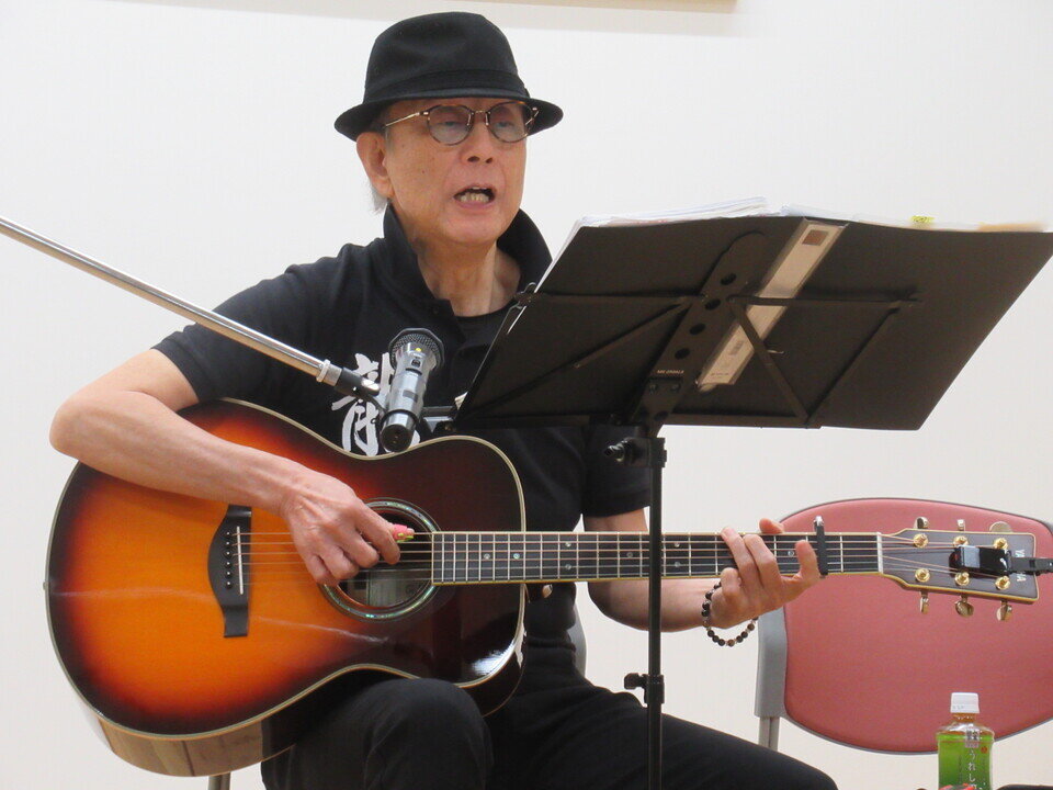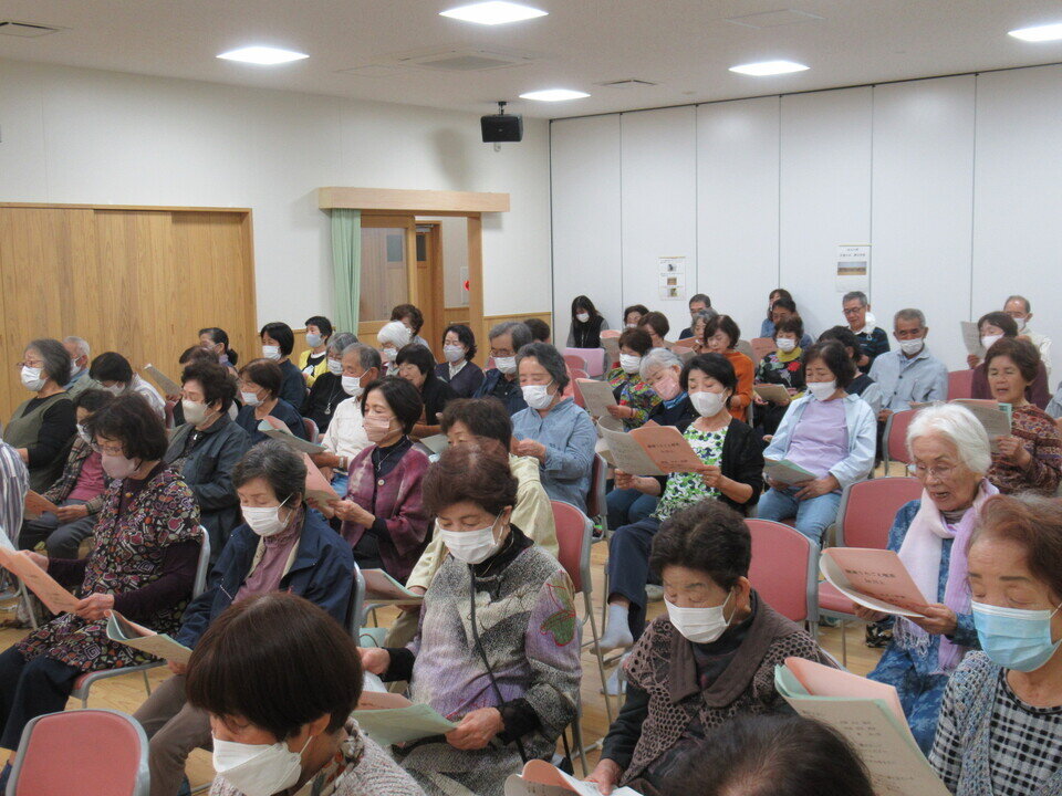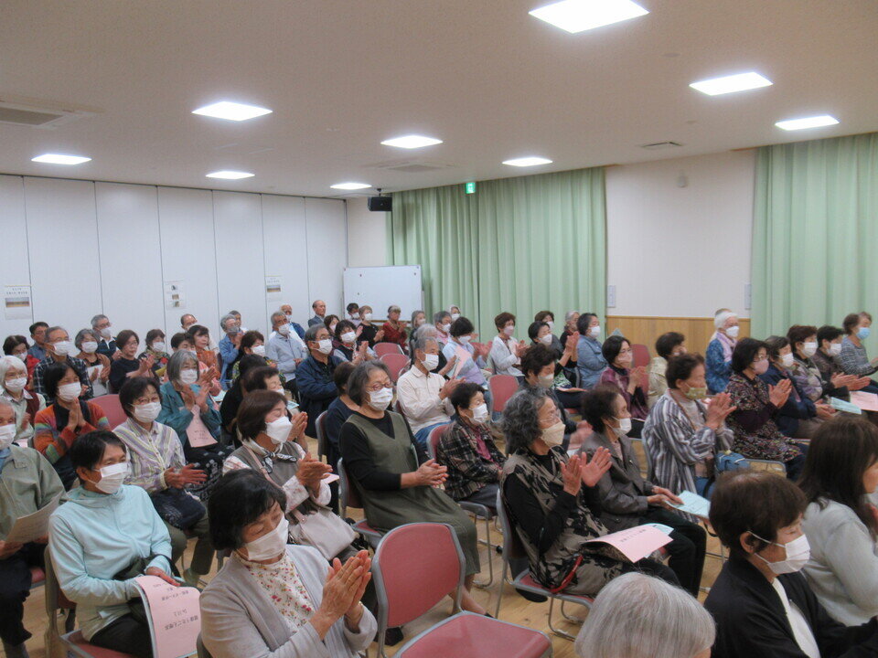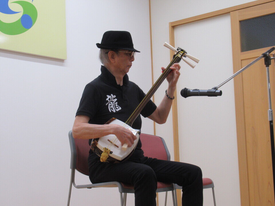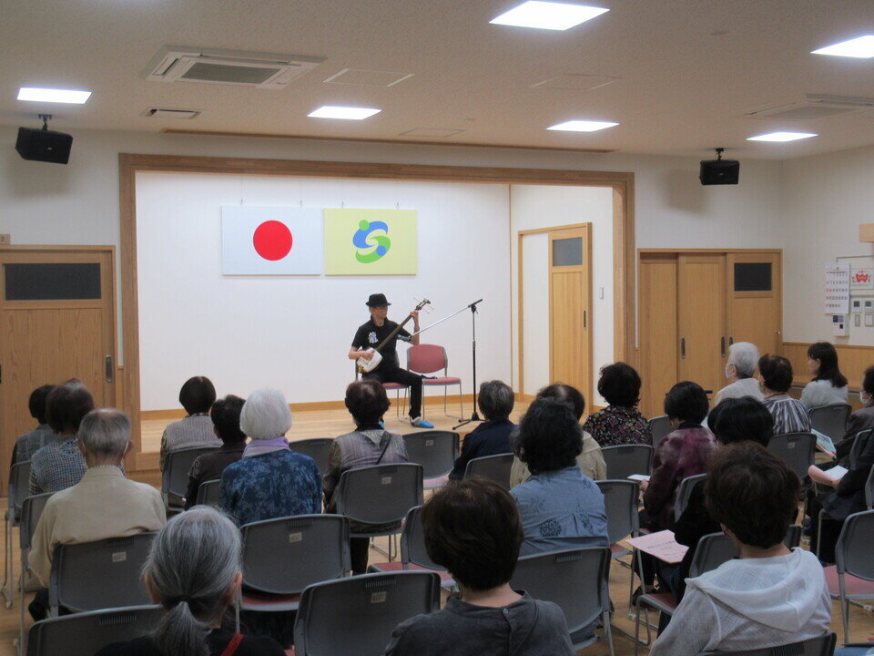 10月24日(木)、清水英龍(西博久)さんをお招きし校区社会福祉協議会との共催で「津軽三味線&ギター演奏」を開催、町内外から来場者80名が参加しました。私たちにはあまり馴染みのない津軽三味線について、その始まりや発展の歴史、楽器のしくみや素材についてのお話も交えつつ「秋田荷方節」「津軽あいや節」「津軽じょんから節」など5曲を披露していただきました。耳に心地よい三味線の音色とビート感は、ひとつの楽器でここまで表現できるのかという迫力がありました。目を閉じて聴き入る人、演奏技術に見入る人など思い思いに音楽を楽しんでいる様子でした。休憩を挟んだ後半は西さんによるギター演奏で懐かしい唱歌や歌謡曲を楽しみました。あらかじめ配布された歌詞カードを手に来場者も一緒に「ふるさと」「四季の歌」「高校三年生」「上を向いて歩こう」などお馴染みの曲を歌って楽しみました。