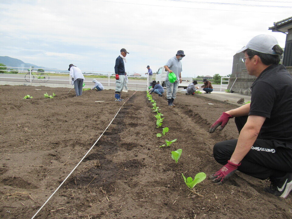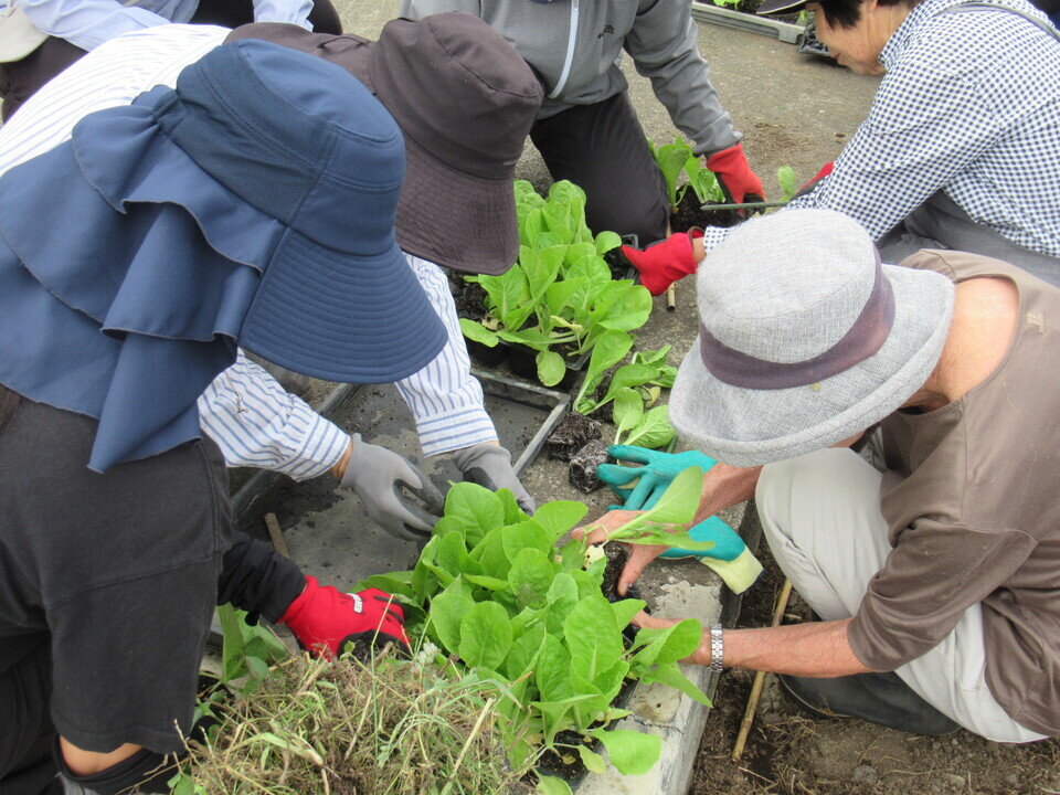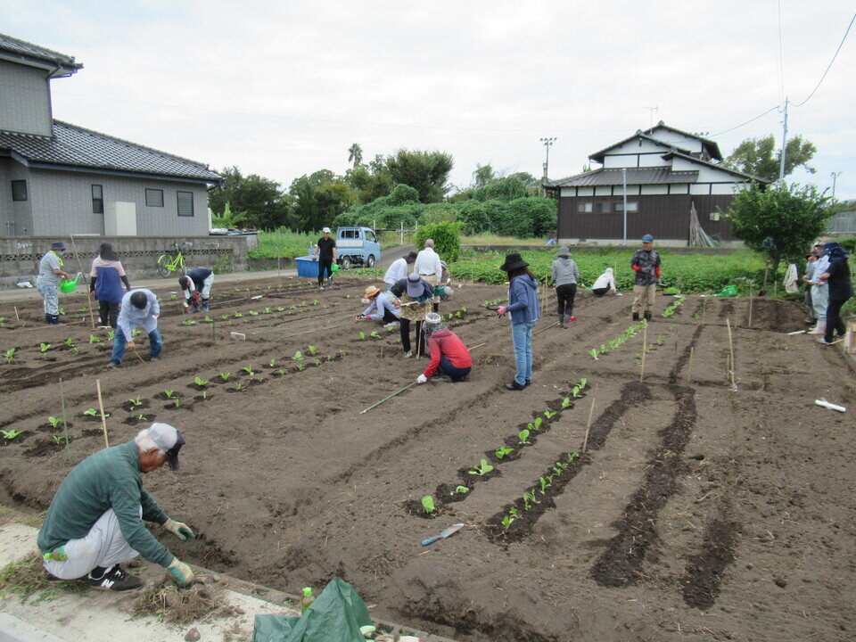 夏野菜収穫後にまち協(農業部会)で、秋冬野菜の植え付け準備(土作り)を事前にして頂きました。第2弾の秋冬野菜は、10月14日(日)教室の参加者とまち協、総勢22名で白菜、チンゲン菜の苗植えと大根、人参、ホウレンソウの種まきをしました。また、今回も一人ひとりが好きな野菜を育てる場所を区画内に設けました。農業部会長の金丸さんから、野菜を害虫から守り、除草をこまめにするなど、個々人の畑管理で野菜の育ち方に差がでてくることをお話しされました。収穫が楽しみです。【10月14日(日)参加者12区画12名 公民館・まち協共催】
