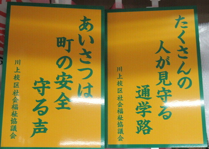 川上っ子お守り隊は、本校区で小学生に対する声かけ事案が発生した時に、即座に「子どもお守り隊防犯パトロールパネル」300枚を作製し「動く110番」として犯罪防止に貢献されました。また川上小学校通学路安全マップのリニューアルや校区社会福祉協議会の支援で、小学校区内の危険個所25か所への立て看板の設置計画など、犯罪や事故のない社会づくりに貢献されてきました。