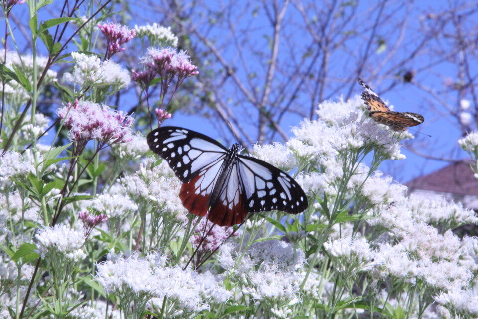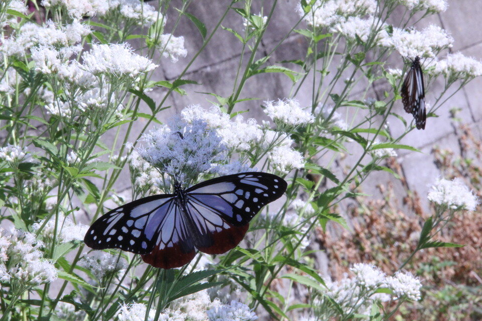 そんなロマンのあるアサギマダラについて知った町内の男性が「ぜひ飛んできて欲しい」という思いでアサギマダラが好むフジバカマを数年前に庭に植えたところ、この秋に念願が叶ったとのことでした。この日は晴れて気温も20度前後の好条件、香りに誘われた4匹が花の蜜を吸いながら羽を休めているような姿を見ることができました。しっかり休んで旅に備えて欲しいものです。【取材日:10月23日 川上某所】