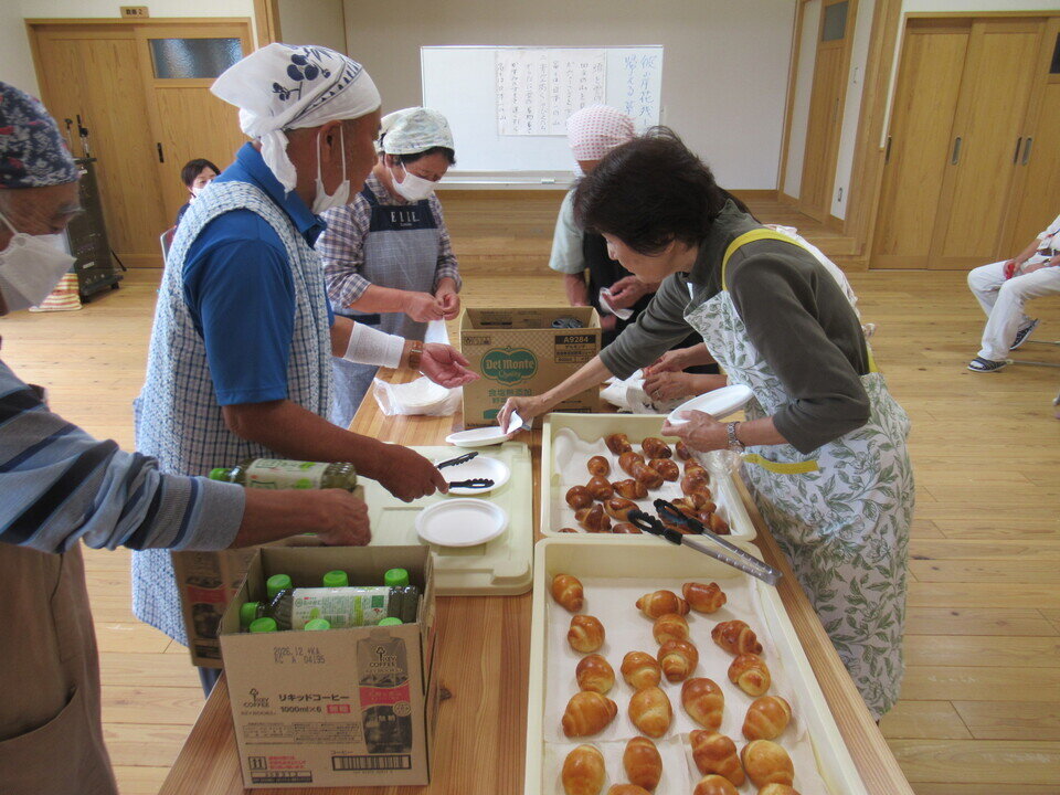 パンを焼いて人々に振舞ってみようと思い立たれた12名のメンバーが、今回初めて川上校区公民館で活動されている川上花しょうぶクラブ(健康体操 総数24名)の皆さんを対象に焼きたてのロールパンを振舞われました。また、メンバーの一人佐古弘子さんによる手品の御披露もありました。代表の栗林康之さんはパンを焼いて地域交流ができることがとっても嬉しく楽しいとおっしゃっていました。