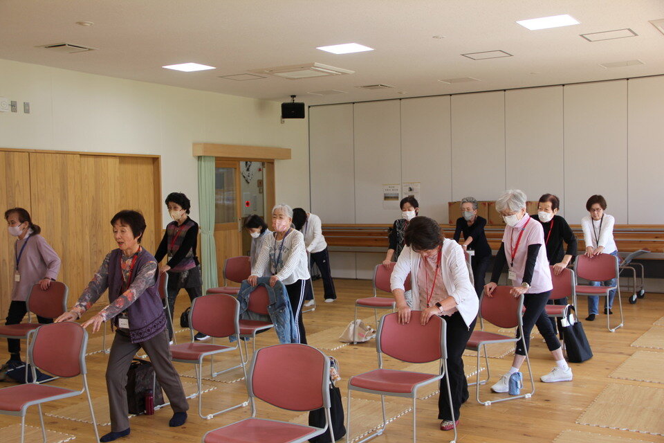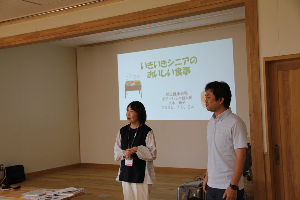 10月24日(金)、川上健康道場の6回目を開催しました。男性4名女性16名合わせて20名が、今月もフィジカルトレーニングコーチの尾川さんの指導でストレッチと筋力維持のためのプログラムを行いました。後半はおたっしゃ本舗大和スタッフさんに「いきいきシニアのおいしい食事」と題して、高齢者が食事で栄養を適切に取るために気を付けたいこと、食事の量や栄養バランス、またそれを継続するためのコツなどについてお話ししていただきました。参加者は5人ずつのグループに分かれ、講師が示した献立のサンプルをよりよくするためにどんな食材を足すかなどを話し合うなどしました。上手に手抜きをすることが継続していく上で大切であるという視点も盛り込まれた内容で参加者からも同意の声が多く聞かれました。