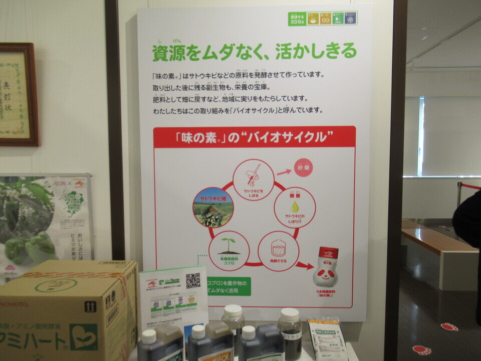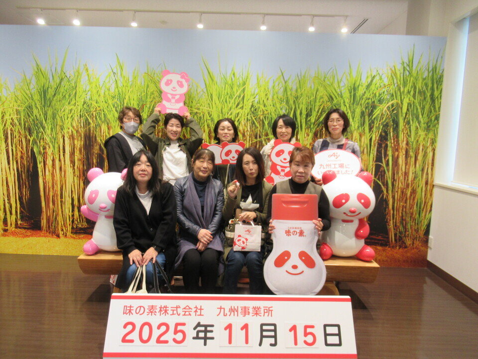 佐賀市諸富町の味の素九州工場の見学に行ってきました。身近な食材の試食や実験、クイズを通してアミノ酸の機能やうま味のひみつを体験しました。製造設備の見学や味覚の実験を通して、アミノ酸やうま味について楽しく学ぶことができました。うま味発見や「味の素Ⓡ」の歴史の説明を受けながら工場内を見て回りました。写真撮影ができないのが残念です。最後はさとうきび畑を背景に「アジパンダⓇ」(味の素株式会社のコーポレートキャラクター)と記念の写真を撮りました。【11月15日(土)参加者9名 女性部主催】