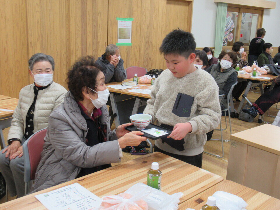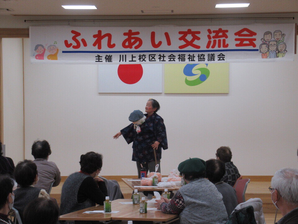 一人暮らしの高齢者(75歳以上)を対象に川上校区ふれあい交流会が開催されました。生田幸子さんによる日舞(船場川)に始まり、今年度デビューして初舞台を踏んだ川上校区合唱団(リバートップ)の歌(君をのせて全5曲)など8演目が披露されました。招待者44名(対象者119名)は、様々な出し物に楽しいひと時を過ごされました。また、従事者を含め全員が川上小茶道クラブによるお茶接待を受けました。最後は、抽選会の景品と校区社協からのお土産(川上五色饅頭、お弁当、ミカン)をいただいて笑顔で帰宅の途につきました。なお、対象者の送迎や交流会の進行については、NPO法人川上絆の会、特別養護老人ホーム シオンの園、佐賀市社会福祉協議会、おたっしゃ本舗大和、川上地区民生委員協議会他、様々の団体から御協力をいただきました。