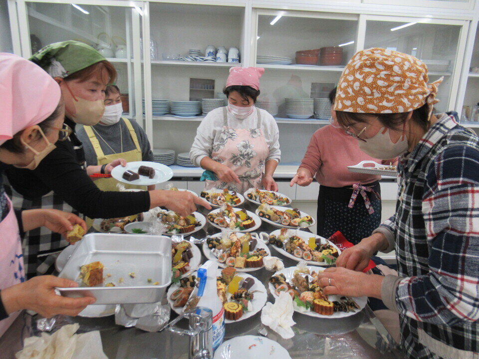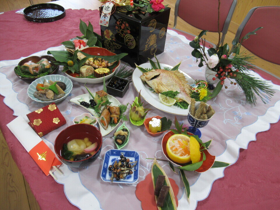 師走に入り毎年恒例行事として開催される、川上校区自治会女性部(江頭由香里部長)主催のお正月料理教室を取材しました。講師の村岡美鈴(食改協)さんから伝統的なおせちの一つ一つの意味、お重の一の重、二の重、三の重に詰めるおせちとレシピの説明がありました。皆さんで調理を分担し、味も見栄えも良い超豪華なおせちが3時間ほどで出来上がりました。