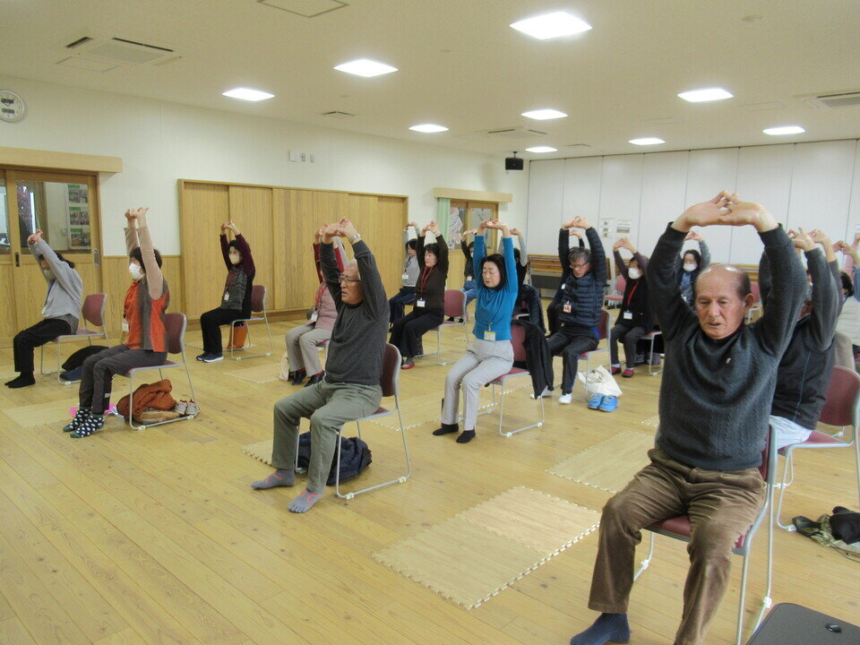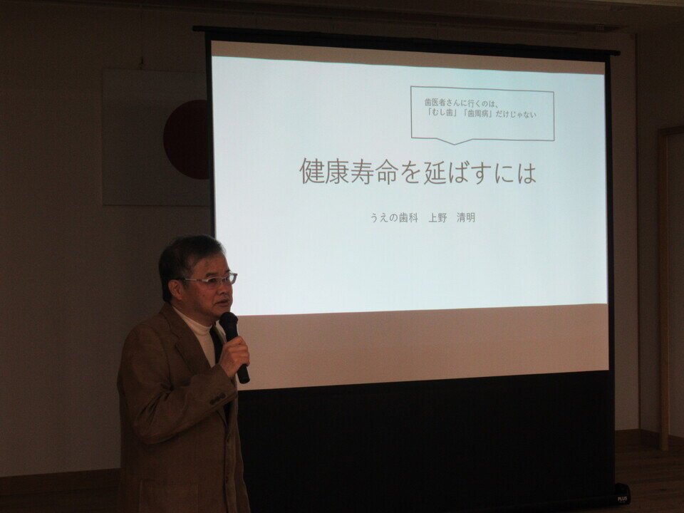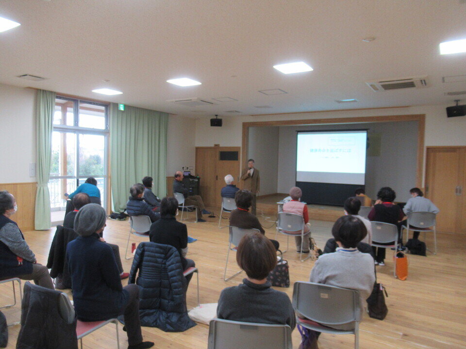 1月23日、川上健康道場の9回目が行われ21名が参加しました。今月も前半はいつものようにフィジカルトレーニングコーチの尾川さんの指導でストレッチと筋力維持、バランスや柔軟性のためのプログラムを行いました。後半は立石自治会長で歯科医師の上野清明さんに「健康寿命と口腔ケア」について講演していただきました。「話す」「食べる」「飲み込む」といった口腔機能の維持が生活の質を維持する上で不可欠であること、口の周りと舌の筋力低下を予防するトレーニングなどについてお話しされました。