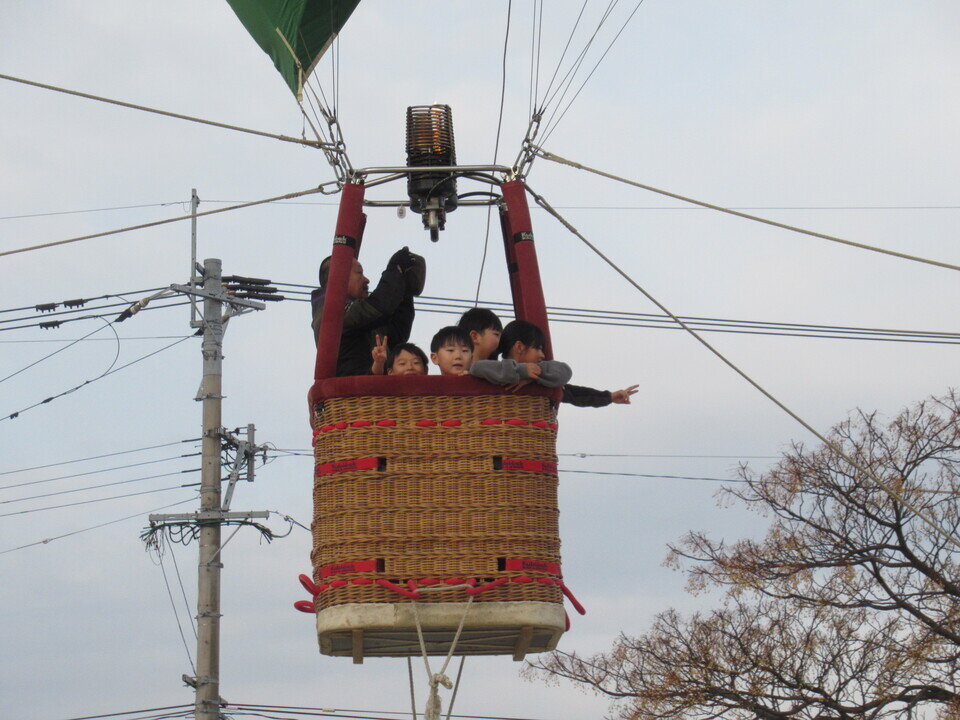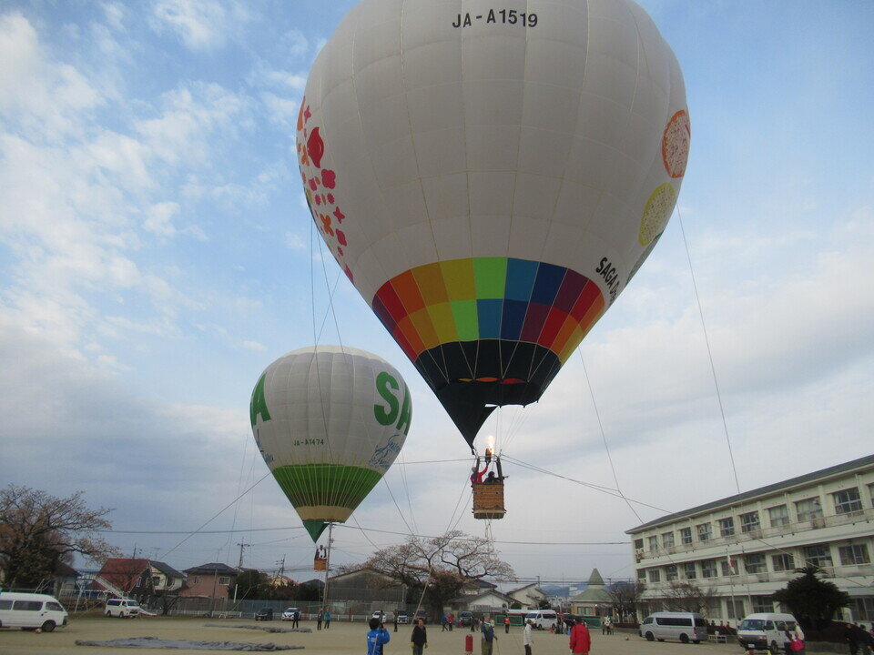 佐賀市が行っている全小学校や特別支援学校を対象とした、バルーン搭乗体験が川上小学校にもやってきました。これは、子どもたちがバルーンを身近に感じ、空飛ぶ体験やバルーンに乗る体験を楽しんでもらうことを目的に開催されています。子どもたちの歓声で包まれた校庭では、初めての体験にバルーンの搭乗順番を待ちきれない様子でした。また、搭乗の合間には、佐賀市のマスコット「まなざし君」とジャンケンをして楽しむ姿もありました。