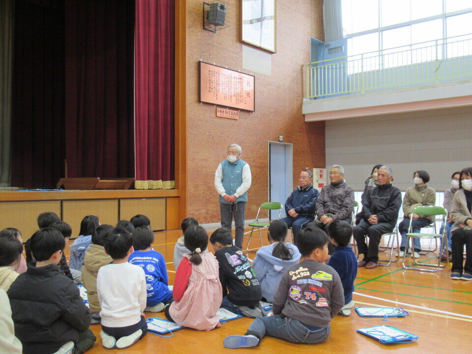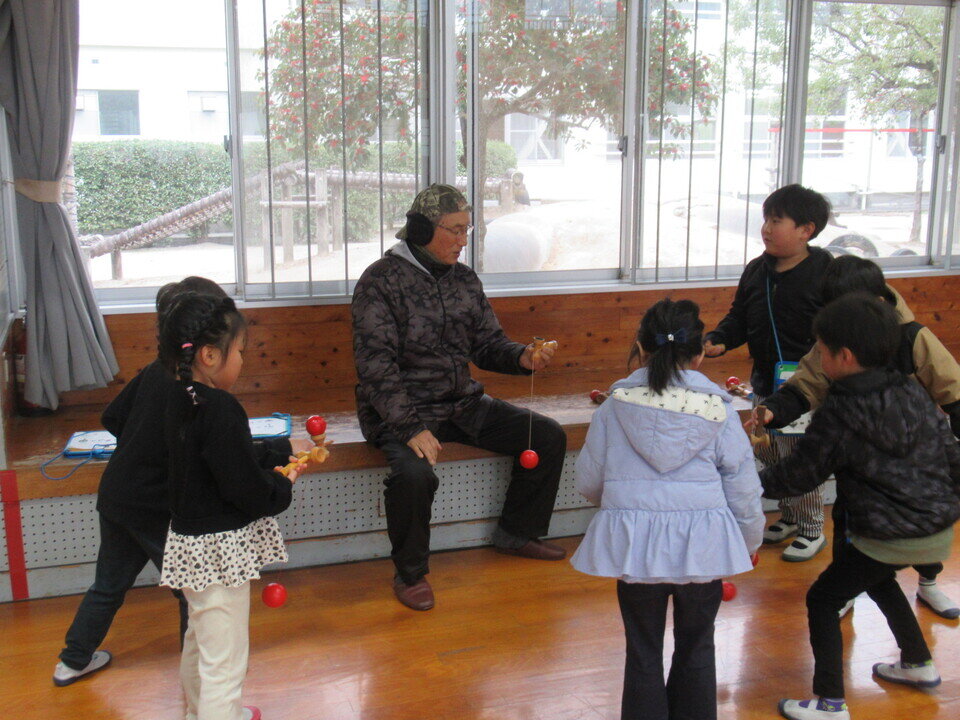 昔は今のようにゲームなどはなく、集まった人数、場所で、みんなが一緒に遊べる工夫をしていました。今に繋ぐ伝承昔遊びを1年生58人に地域の人(民生委員・児童委員、まち協、校区社協他有志)15人が(けん玉、ダルマ落とし、お手玉、コマ回し、羽根つき、竹とんぼ、紙飛行機)昔遊んだ経験を活かして、遊び方を教えてくれました。子どもたちは、初めての体験に悪戦苦闘しながらも遊びに夢中になっていました。地域の人も童心に返り、子どもたちとひと時を楽しく過ごしました。
