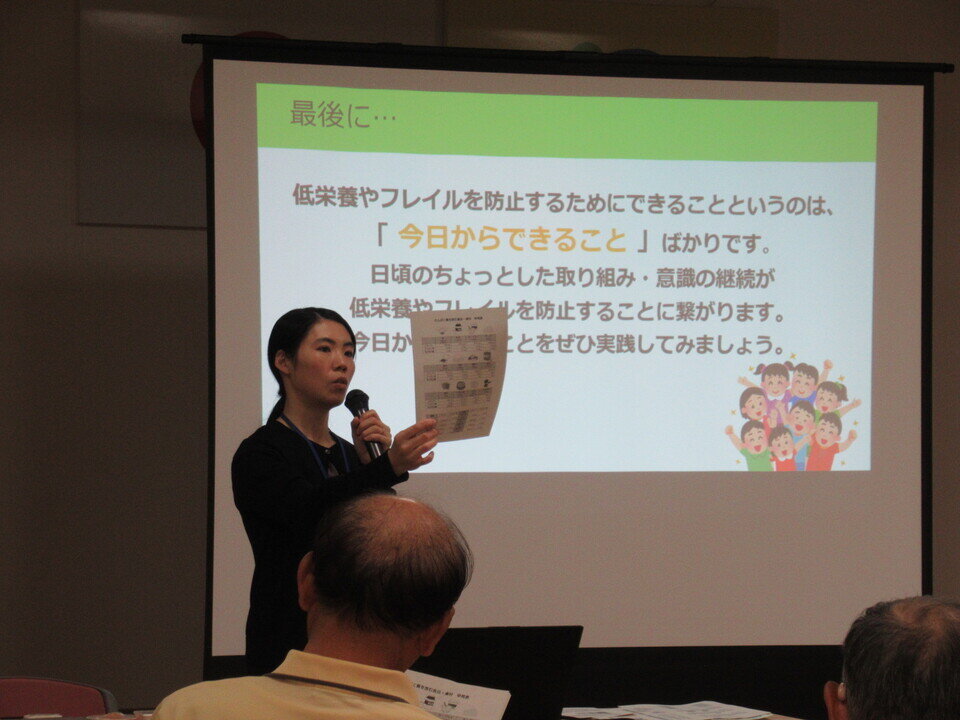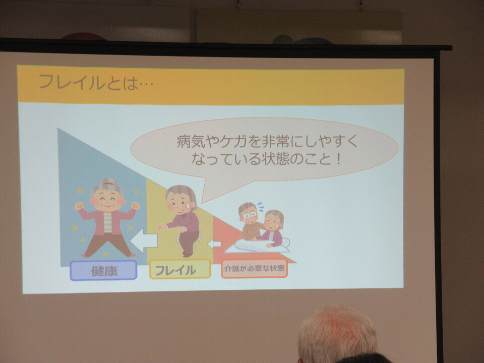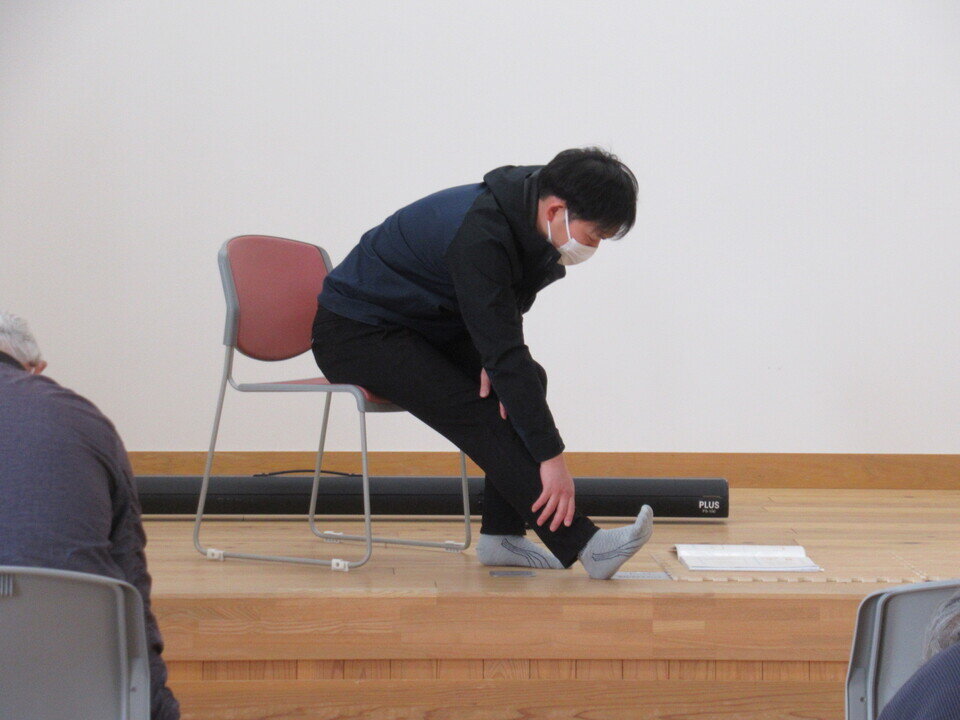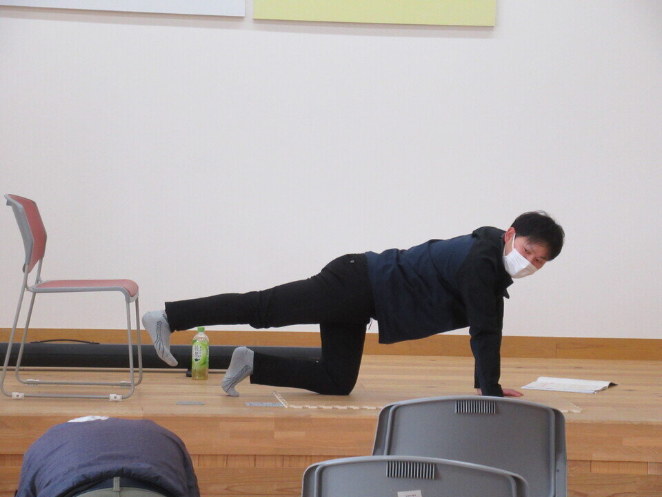 3月27日、川上健康道場の11回目が行われました。今年度の最終回でしたが、21名が参加されました。今月も前半はフィジカルトレーニングコーチの尾川さんの指導でストレッチと筋力維持、バランスや柔軟性のためのプログラムを行いました。後半は、「栄養」について佐賀市高齢福祉課管理栄養士の渡辺若菜さんの講義でした。「低栄養・フレイル予防で健康長寿!」のテーマで、フレイルを予防するためには、①バランスの良い食事 ②エネルギー・たんぱく質をしっかり摂りましょう③しっかりよく噛んで食べましょう の3つの目標達成を目指して具体的な方法を学びました。どれも「今日からできること」ばかりでした。自分の状態を早めに気づく事が健康への第一歩です。