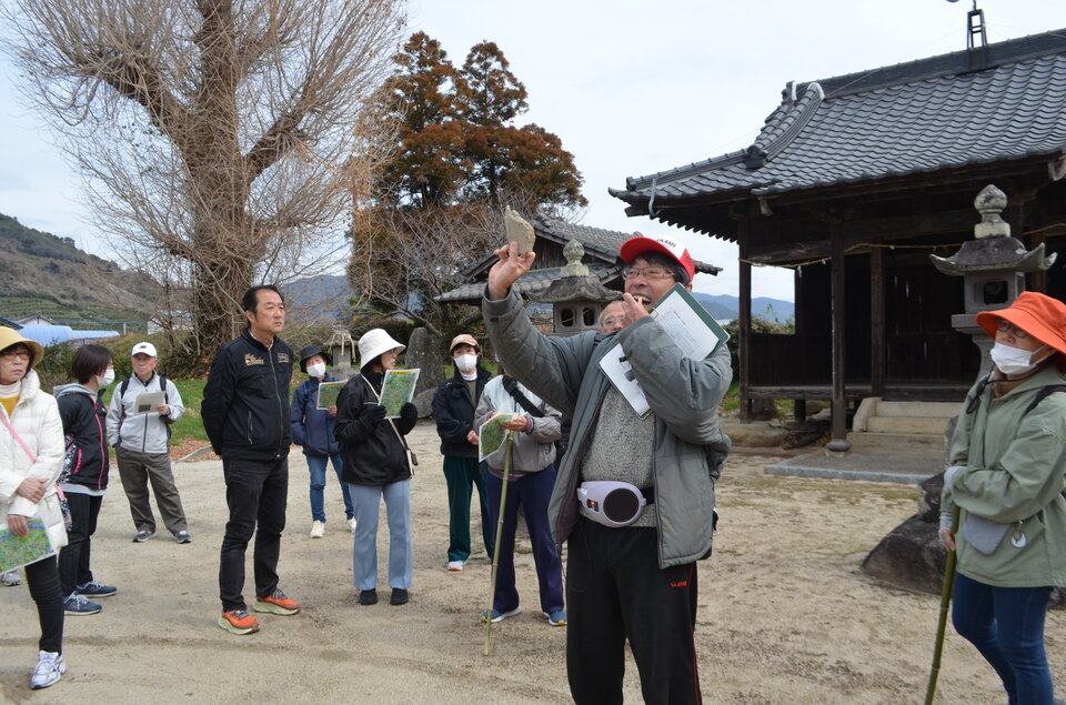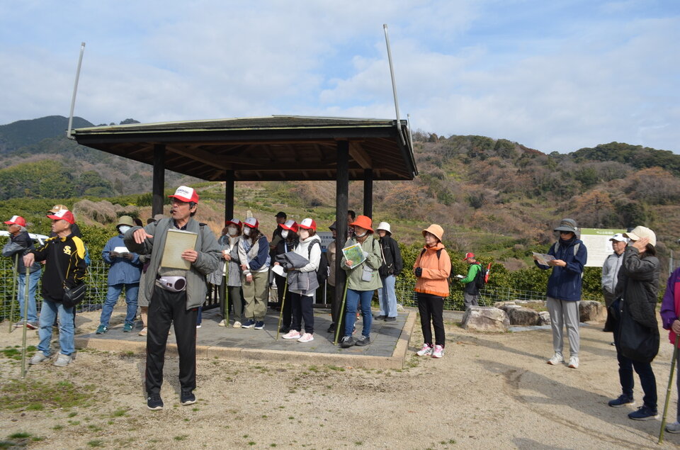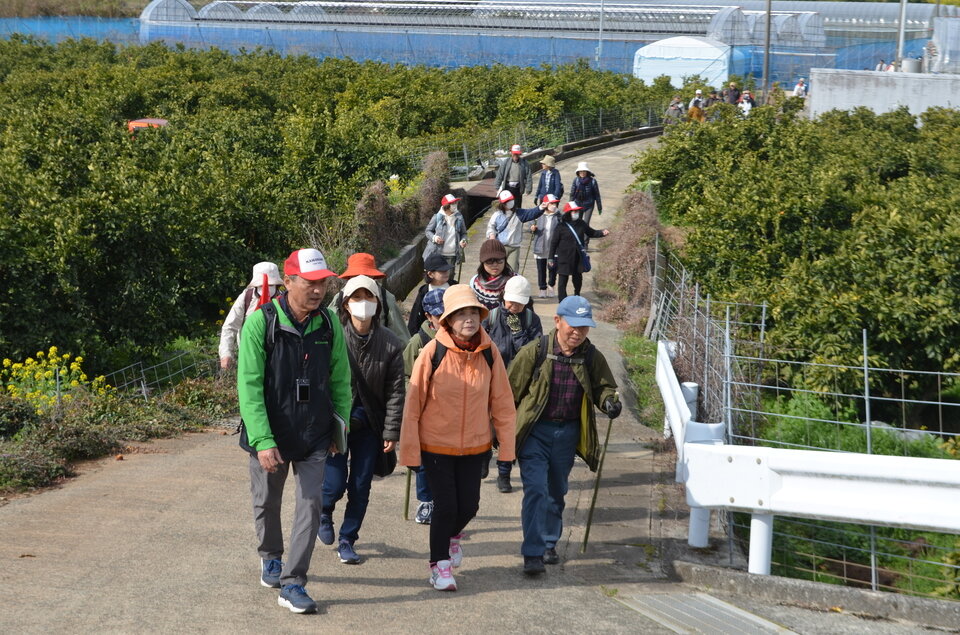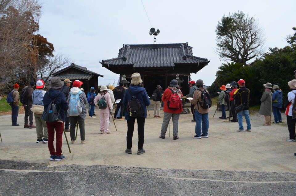 令和8年3月8日(日)令和7年度最後のフットパスを開催しました。朝は肌寒かったものの段々とフットパス日和になりました。64名の参加者と かわでん さんを発着とし赤坂展望所~健福寺~大願寺廃寺跡~お台場展望所を歩きました。