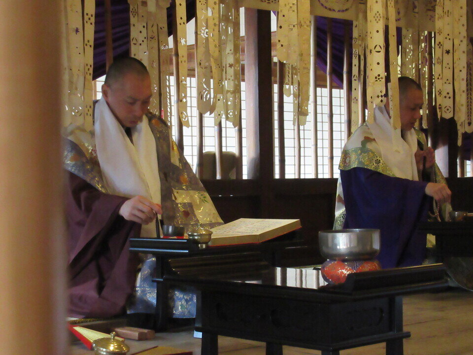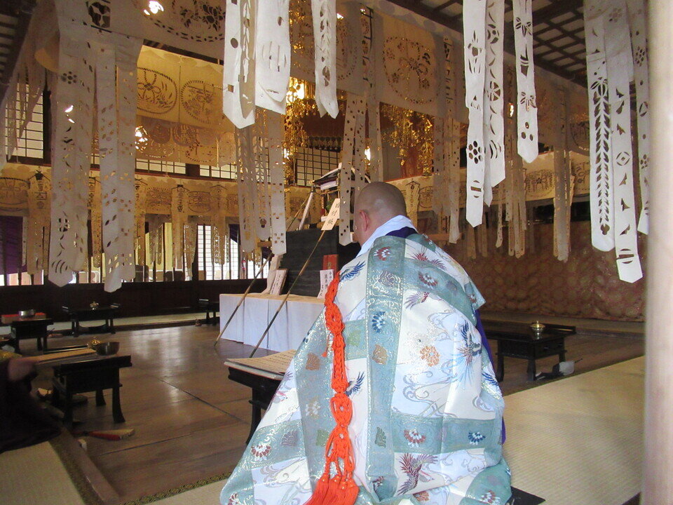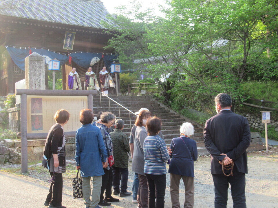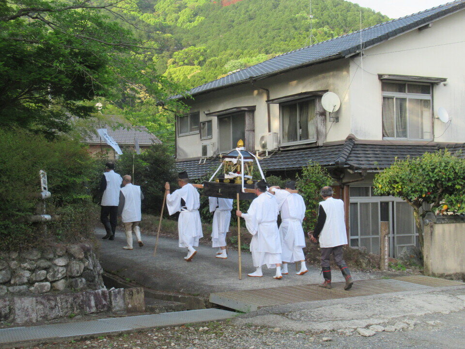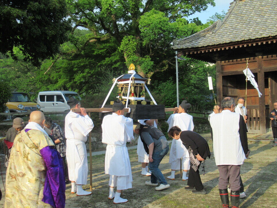 佐賀市大和町川上にある(河上山神通密寺)実相院で4月10日から20日にかけて恒例の「妙法経会」(通称「お経会」)が行われました。900年以上の長い歴史をもち、宗教に区別なく信徒が集うことからも全国的にも稀な大法要と言われ、本堂にて一日3回のお経があがります。最終日の20日にはクライマックスの「お経送り」がありました。書写した経巻と過去帳を納めた神輿を、白衣に烏帽子・わらじ姿の若者衆が担いで山の中の経塚に納める儀式です。途中の仁王門では地元の人たちが集まっていました。僧の読経が流れる中、無病息災を願って神輿を3回くぐり、山路を登っていく神輿を見送りました。