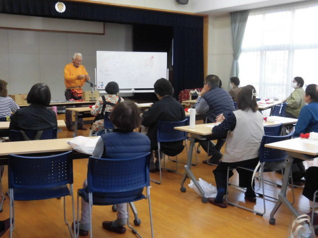 いつもの座学と違っての作業。参加者のみなさんは「これでサンタの帽子になるとね〜」と関心しながら、おのおの手を動かされていました。![]()