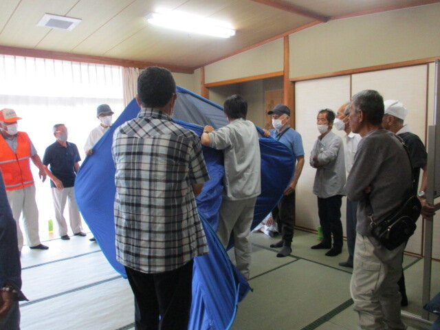 北川副自主防災実践本部(俣野初朗本部長)は9月3日(日)に北川副公民館で防災訓練を実施、各町区の自主防災会役員ら88人が参加し、避難所設営や消火器の操作など実践に即した訓練を行いました。この訓練は、関東大震災を教訓にした「9・1全国防災の日」に合わせて毎年実施しています。今年は関東大震災から100年の節目にあたり、より実践的な訓練を目指しました。屋内では、避難所に指定された際に設置するパーテーション組み立てから撤収までを訓練。また電気や水道が止まった時に使用するトイレの使い方も学びました。屋外では、本物の消火器を使い、初期消火を参加者全員が体験しました。 パーテーションは設置よりも撤収の方が難しく「たたむコツをつかまないと」といった感想が聞かれ、消火訓練では消火剤の噴射が10秒―15秒と短く「狙いの定め方がポイント」と、それぞれ習熟の必要性を実感した様子でした。 最後に市が配備する防災倉庫で資機材を点検した後、炊き出し訓練で校区女性の会が作った昼食が振る舞われました。(広報委・宮崎俊一) ![]()