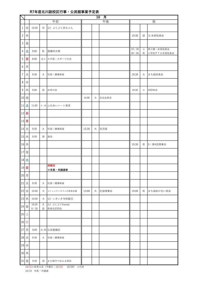 北川副で開催される公民館事業・地域行事のイベントカレンダーです。
