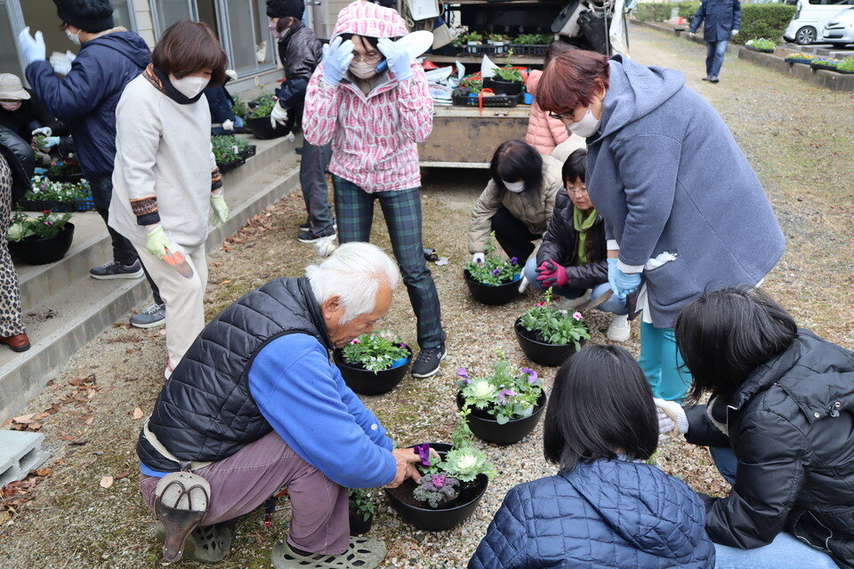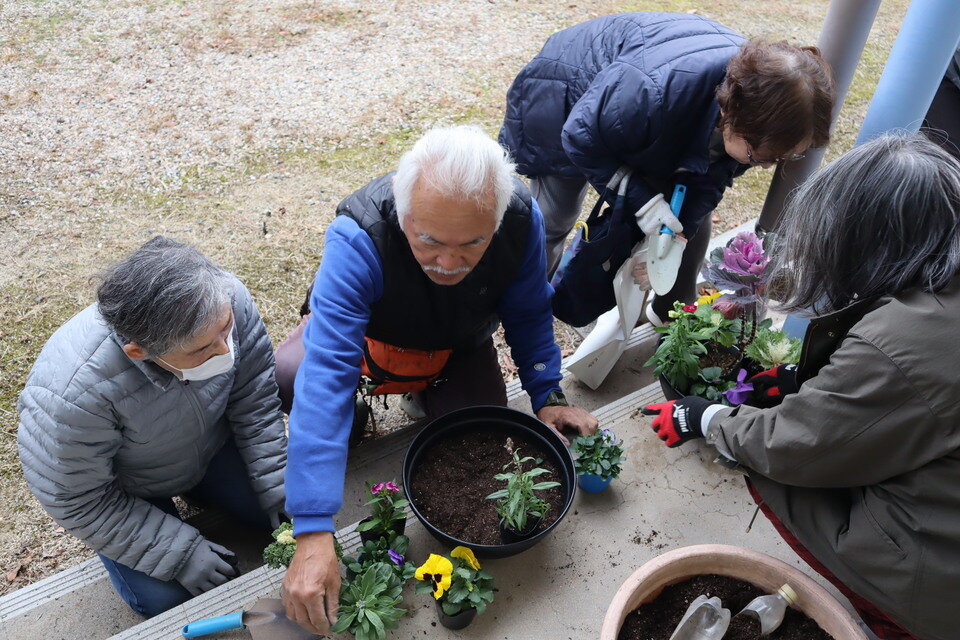 今回は「冬の寄植えと花壇づくりのコツ」をテーマに、みどりのカウンセラーである中川先生をお招きし開催しましたところ、校区の方30名にご参加いただきました。