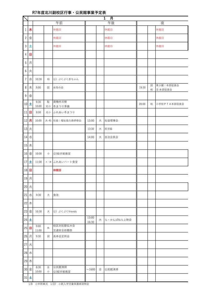 北川副で開催される公民館事業・地域行事のイベントカレンダーです。
