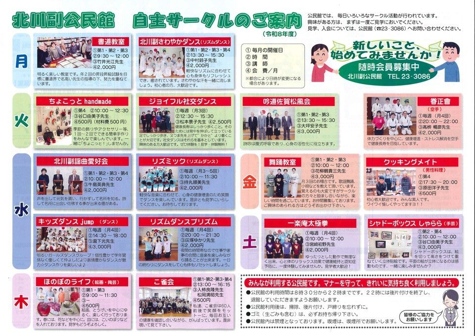 令和8年度のサークルを紹介します。紹介文は、各サークルで考えたものです。興味がある方は、北川副公民館(℡:23-3086)まで、ご連絡ください。