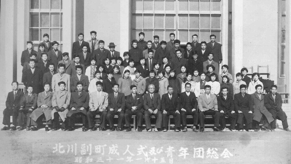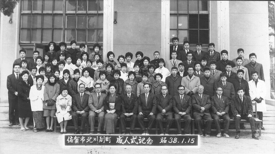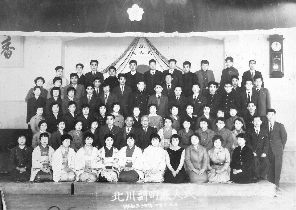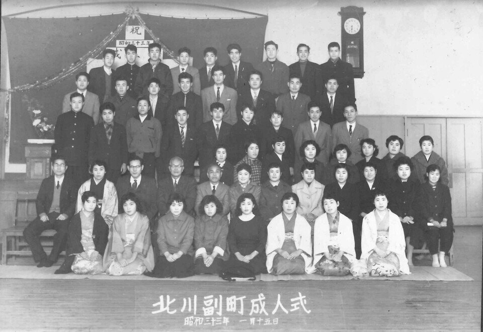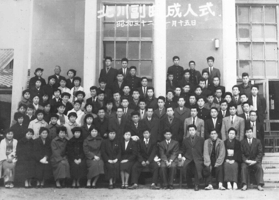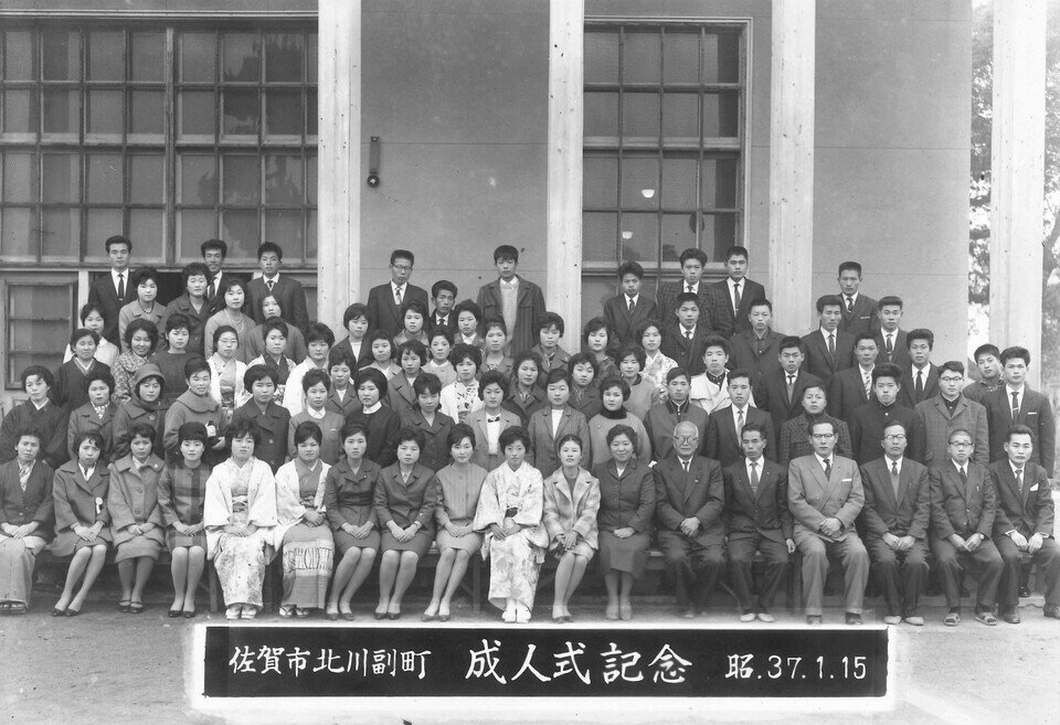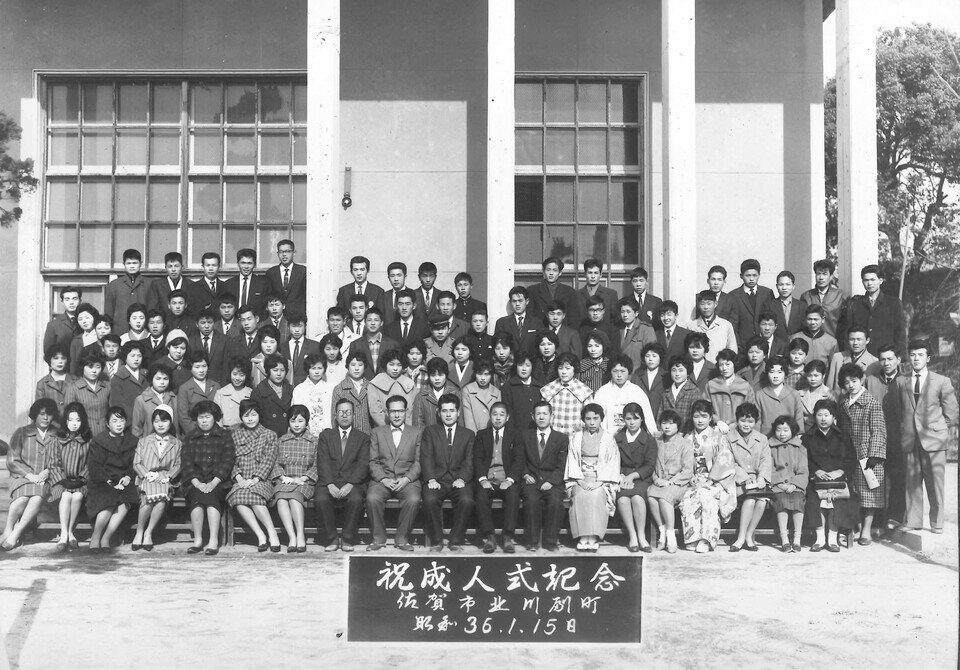 昭和31〜38年の成人式の集合写真が公民館から出てきました。撮影場所は木造の頃(2世代前)の北川副小学校です。