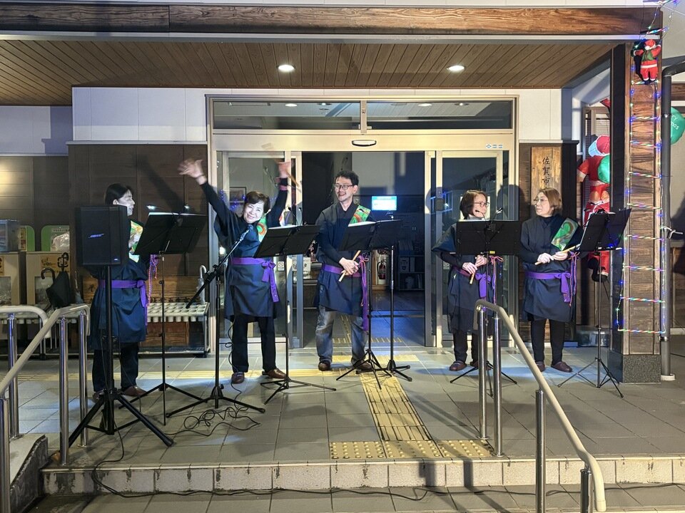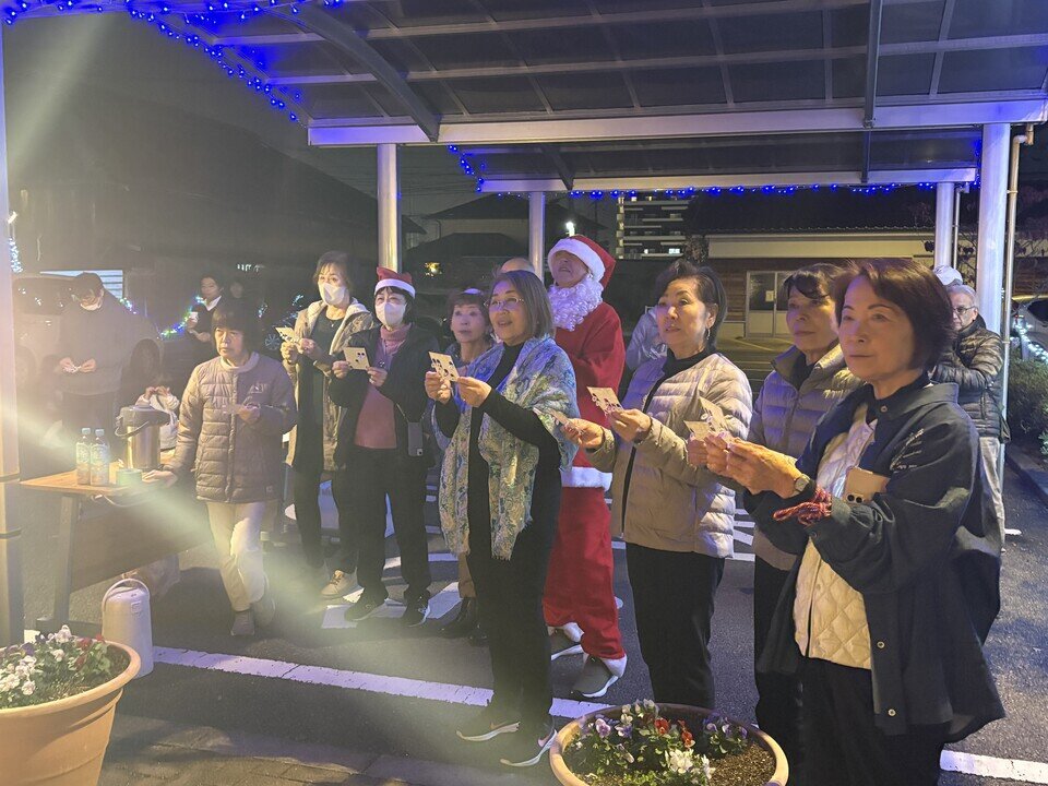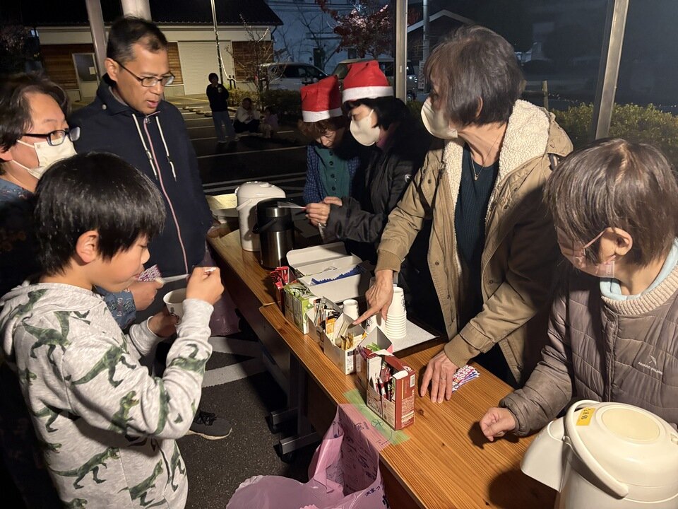 不審者と間違えられて取り囲まれるサンタクロース...ではなく、出演していただいた「しの笛ゆめクラブ」のみなさんを労うT原会長。