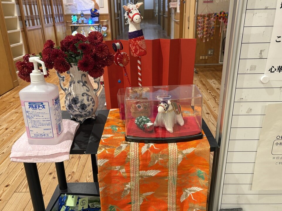 神野公民館の玄関正面には、ひと足先に干支の「午」が飾られています。