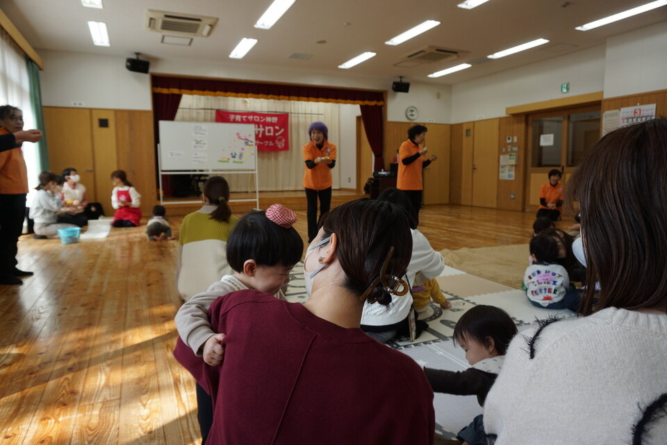 はじめは、お手玉バルーン支部のみなさんによる手遊びを親子で楽しみ、、
