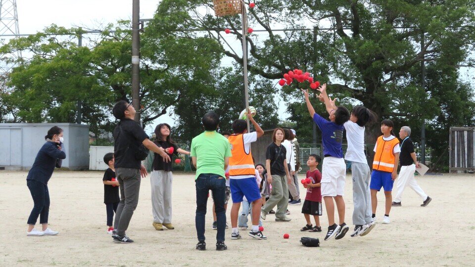この日は午後から雨の予報でしたがなんとか小雨がぱらつく程度にとどまり、予定どおり15時に開会が宣言されました。オープニングアクトは2年ぶりとなる町区対抗スポーツイベント。9町区が参加し老若男女混合チームで玉入れを競い、西分自治会が圧倒的成績で優勝しました。