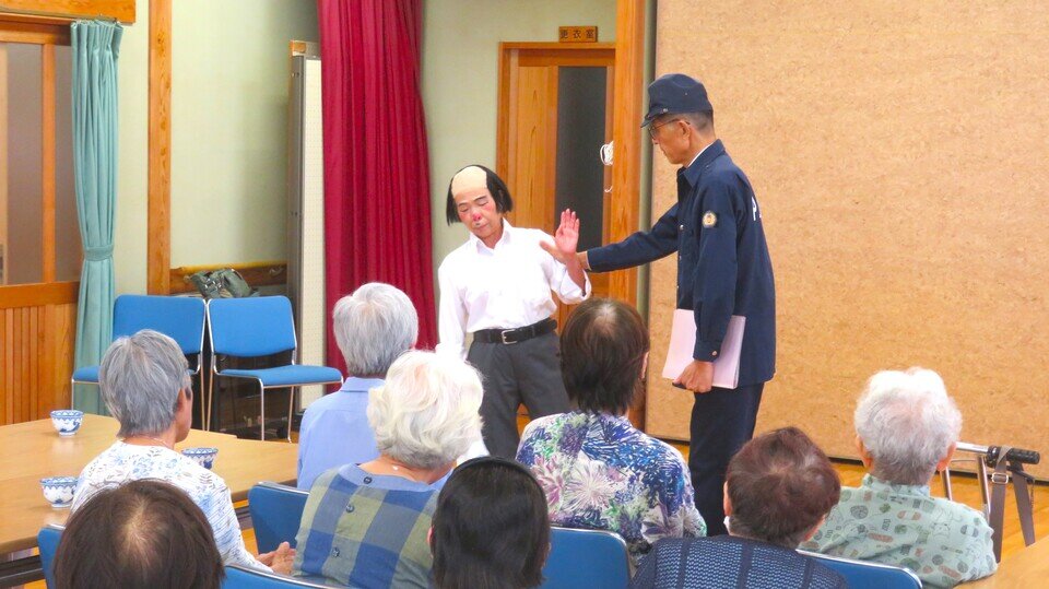 この日は「酔っぱらいと警察官」という演目が披露されました。アドリブでしょうか、巨勢の地名や施設がたびたび登場。滑稽な動きと噛み合わない会話に、会場はたびたび大きな笑い声に包まれました。