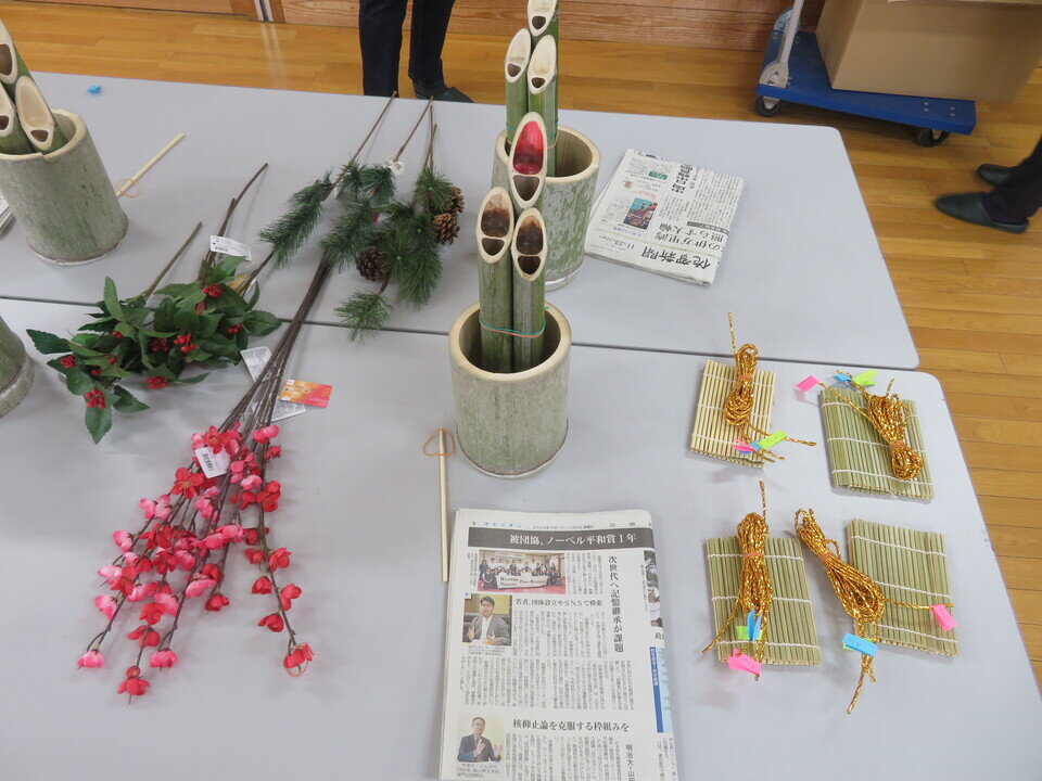 作り方の指導をするのは社協のみなさん。竹を金紐で結び、松や梅などの縁起物を加えます。完成したのは高さ30センチほどの小さな門松ですが、子どもたちはそれぞれの出来栄えに満足そうに笑みを浮かべていました。(参加者37人)![]()