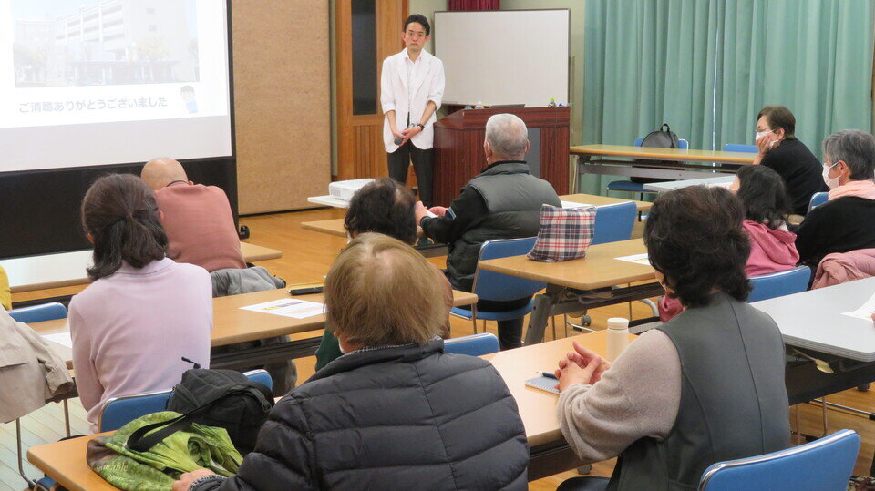 佐賀中部病院整形外科医の中島武馬先生を招き、『暮らしと健康講座』第4回を3月11日(水)に巨勢公民館で開催しました。この日のテーマは「股関節・膝関節の痛み」。前半は、運動器の健康を保つことの大切さについて。健康寿命を伸ばすためには、運動、栄養、社会参加が肝要とのことでした。後半は、ナビゲーションシステムやロボティックアームなどを活用した最新の手術方法の解説があり、参加した人たちはメモを取りながら耳を傾けていました。(参加者28人)主催:巨勢公民館、巨勢まちづくり協議会福祉・健康部会