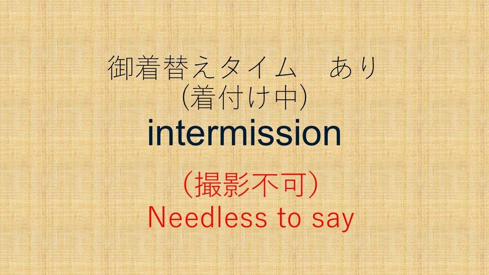 えいが「ベン・ハー(Ben-Hur)」や「かぜとともにさりぬ(Gone With the Wind)」などにありますインターミッション(なかやすみ)が2かいありました。※このひがせいじんしきのひであったため、いしょうのかずが............(なみだofさがしこくさいか)。